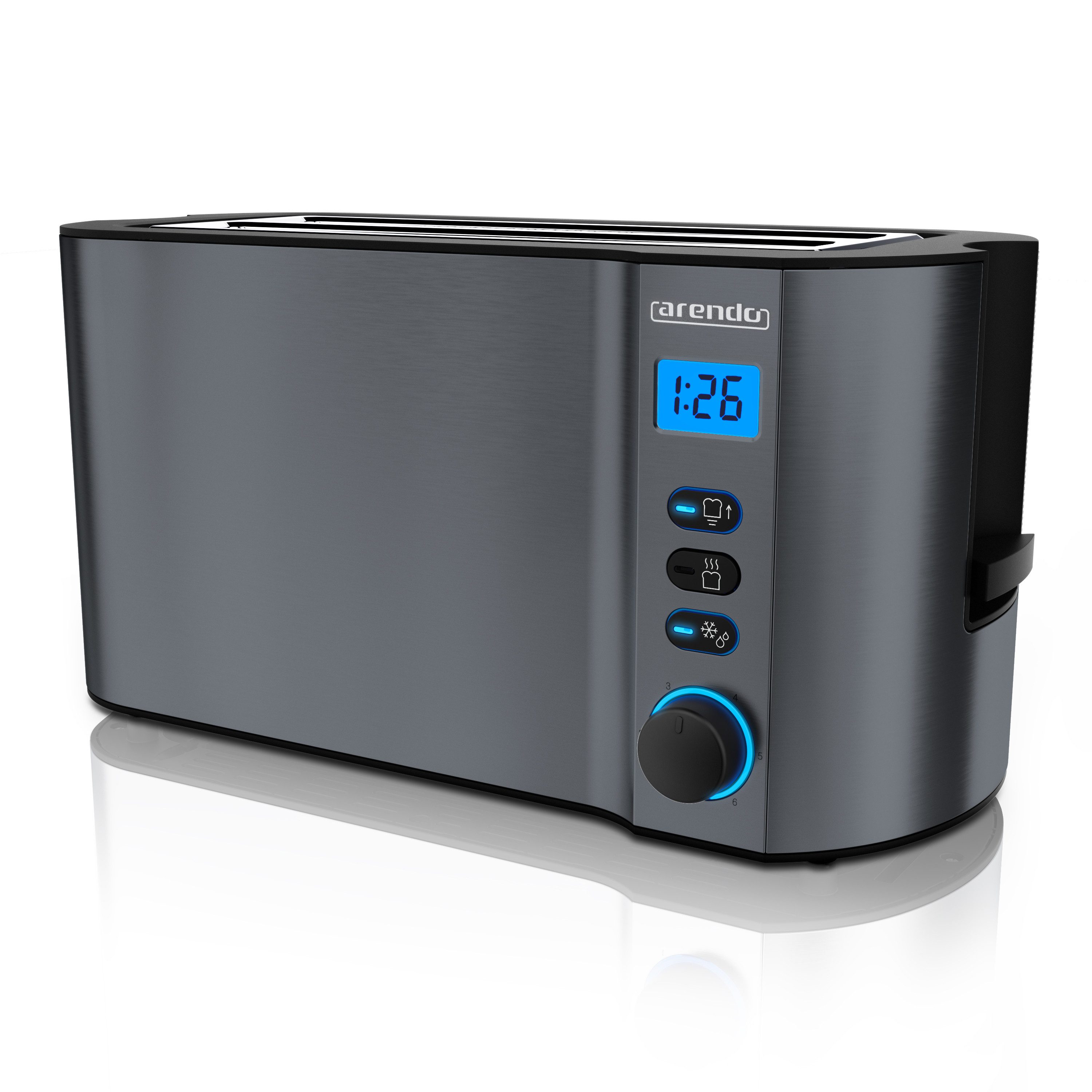 Der Arendo MANHA 4-Scheiben-Edelstahl-Langschlitz-Toaster. Mit Displayanzeige und integriertem Brötchenhalter für das