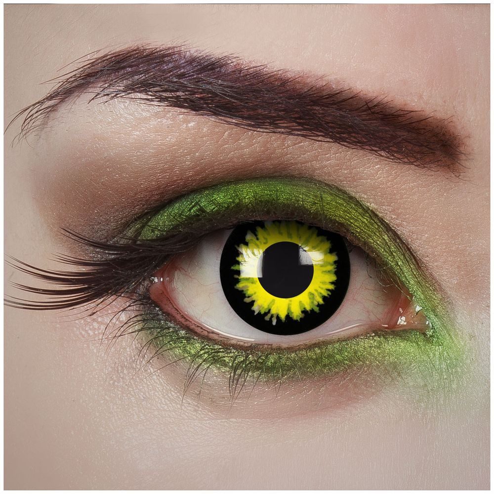 Dieser durchdringende Blick bleibt jedem, der Sie ansieht, unvergesslich an diesem Kostüm Party Abend. Mysteriös, beängstigend und fremd werden Sie mit den farbigen Kontaktlinsen in Schwarz und Gelb auf Ihre Mitmenschen wirken. Die schwarzen Kontaktlinsen mit gelber Färbung sind Jahreslinsen in sehr hoher Qualität. Ihre Augen glühen in einem grellen Gelb und verleihen Ihnen eine dämonische Ausstrahlung. Magisch und unheimlich gehen Sie Ihren Weg auf der Horror Party und interessierte Augen werden Ihnen folgen. Diese weichen Kontaktlinsen sind ohne Stärke und durch den hohen Wassergehalt von zweiundvierzig Prozent sehr angenehm zu tragen. Die 12 Monatslinsen können ein ganzes Jahr lang immer wieder verwendet werden. Mit den schwarzen Kontaktlinsen erhalten Sie unheimlich coole Kostüm Accessoires mit Gruseleffekt