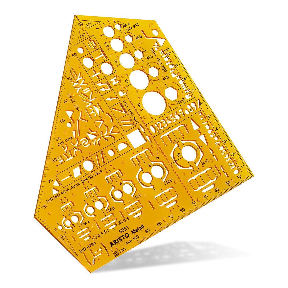 Hier sind die Keyfacts zur Aristo Schablone Schulwinkel Metall im Format 155 x 155 mm mit Tuschenoppen: