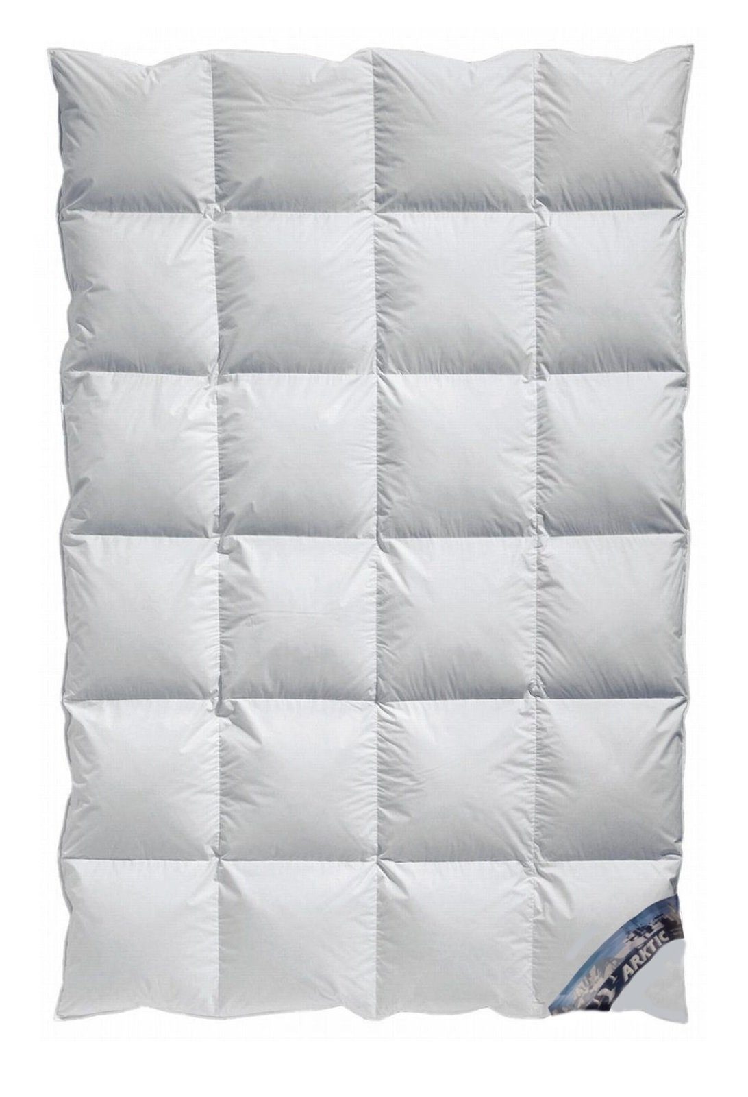 ... die extra warme Daunendecke Winterdecke mit Wärmegrad 5 zum sensationell günstigen Preis! (Abbildung 135x200 cm) Diese extra warme Winter Daunendecke ist für Schläfer und Schläferinnen gedacht, die ein besonders hohes Wärmebedürfnis haben auch ideal für die sehr kalte Zeit im Jahr, eine perfekte extra-warme Winterdecke. Diese extra warme Daunendecke ist ideal, wenn eine Winterdecke "zu dünn" ist. Optimale extra warme Wärmeverteilung durch die höhe Füllmenge und den 8 cm Innensteg. Der Innensteg befindet sich in der Decke und ist ein 8 cm breites Stoffband der den Oberstoff und Unterstoff trennt. Durch den 8 cm Innensteg/Hochsteg bekommt die Kassette mehr Volumen und sorgt so für eine extra warme Wärmeisolierung. Die 8-cm hohen Innenstege und die Kassettensteppung verhindern das Verrutschen der Füllung, und die Decke bietet überall gleichmäßige Wärme ohne Kältezonen. Sicherheit und Эко-товар durch kontrollierte Qualität: Schadstoff geprüft. Die Decke kann umgehend nach Erhalt verwendet werden. Bitte hierfür aus der Tasche nehmen und leicht aufschütteln und auslüften lassen. Mit frischer Bettwäsche beziehen. Nicht auf die Decke sitzen oder liegen, das schadet den feinen Daunen. Pflege: täglich aufschütteln, ab und zu lüften (nicht in der prallen Sonne oder bei feuchtem Wetter), nicht absaugen oder klopfen! Pflegeleicht: Waschbar bis 60°C, bitte unbedingt im Wäschetrockner trocknen, denn nur so bleiben die Daunen so fluffig. bitte nur Daunenwaschmittel verwenden keinen Weichspüler, der verklebt die Daunen. Anschließend vollständig im Trockner trocknen, aufschütteln und den trocken Vorgang wiederholen. Alternativ empfehlen eine fachgerechte Wäsche im Bettenfachgeschäft, denn meist sind die haushaltsüblichen Trommeln zu klein. Da Daunen eine hohe Selbstreinigungskraft besitzen, empfehlen wir, eine Daunendecke frühestens nach 3-4 Jahren zu waschen. Bitte Pflegehinweise am Etikett beachten. erhältliche Größen/Kassetten/Füllmenge 135x200 cm 4x6 Kassetten mit 1.350 g Füllmenge 155x220 cm 4x6 Kassetten mit 1.680 g Füllmenge 200x200 cm 6x6 Kassetten mit 2.000 g Füllmenge 200x220 cm 6x6 Kassetten mit 2.200 g Füllmenge 240x220 cm 6x7 Kassetten mit 2.600 g Füllmenge Die ideale Daunendecke für die sehr kalte Jahreszeit oder einfach nur für alle Schläfer und Schläferinnen, die ein sehr großes Wärmebedürfnis haben und auf ein Naturprodukt nicht verzichten möchten: Sie erhalten ein angenehm trockenes und warmes Schlafklima. Hergestellt in Deutschland. Die Daunendecke wird in einer praktischen Aufbewahrungstasche geliefert.