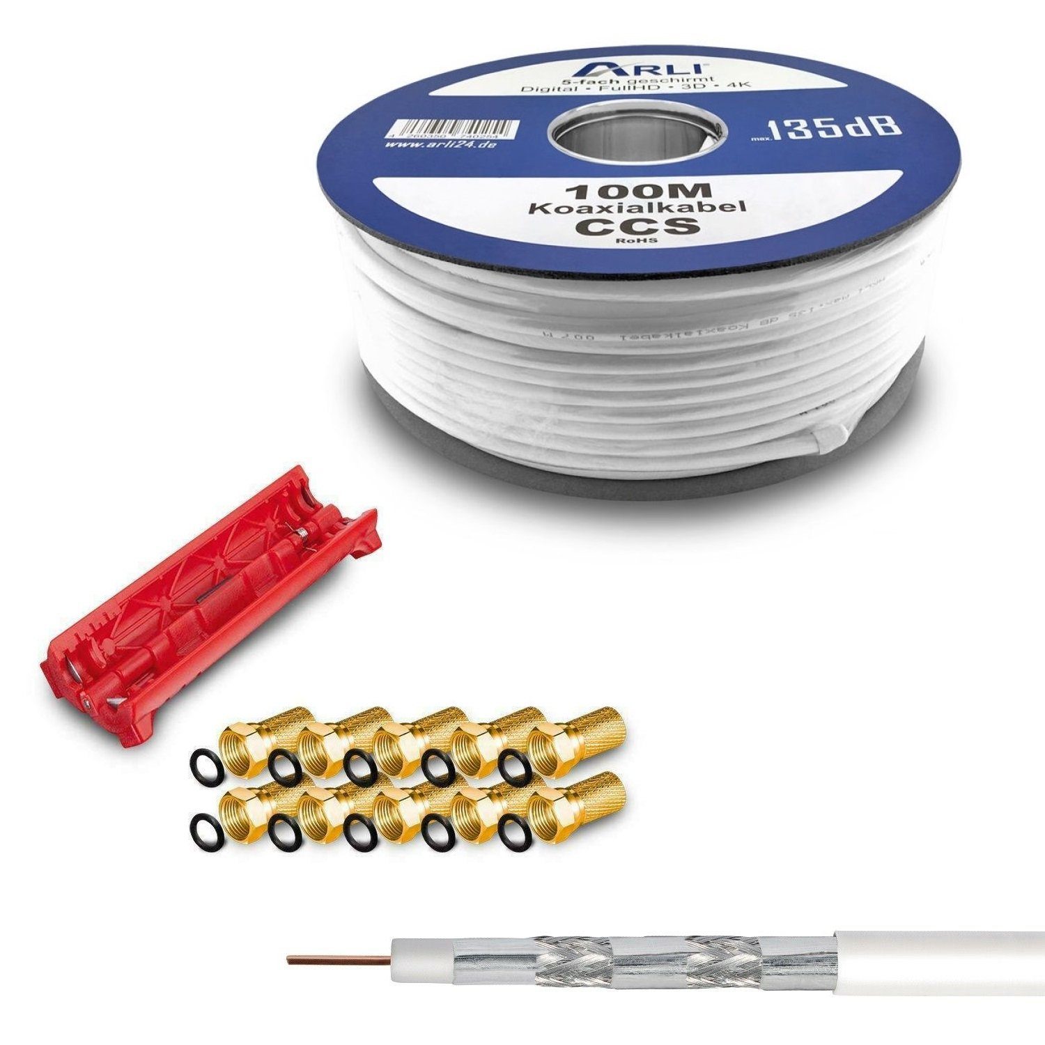 Lieferumfang | 1x 100m ARLI Koaxialkabel I 1x ARLI Universal Abisoliermesser I 10x ARLI F-Stecker vergoldet mit breiter Mutter und Dichtring |
