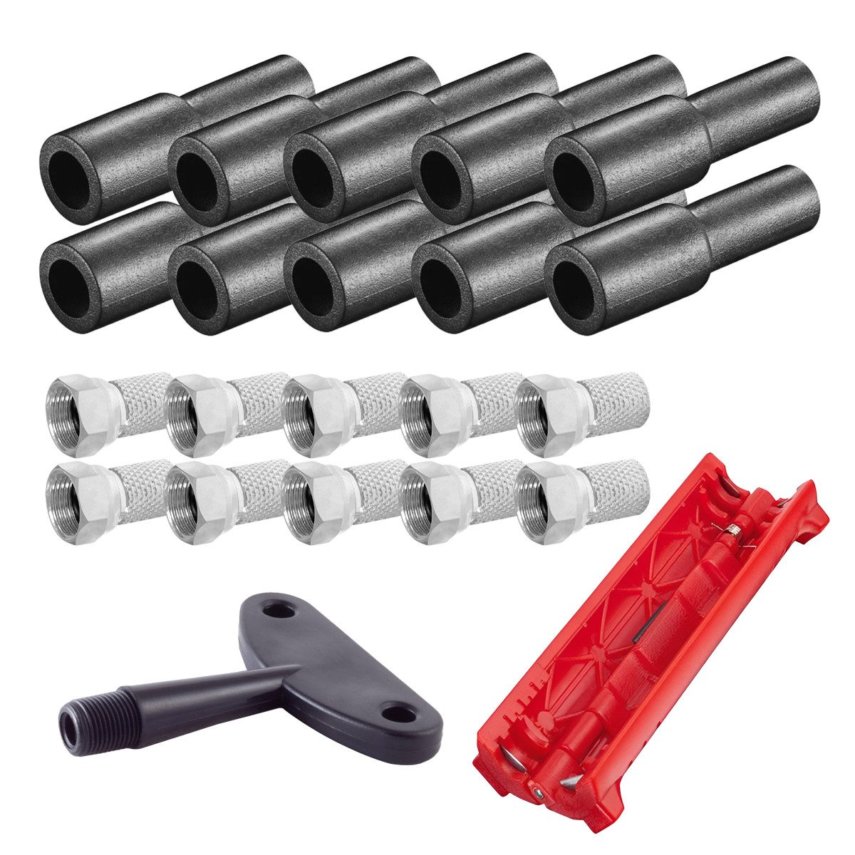 Lieferumfang | 1x Aufdrehhilfe, Stahl 10x F-Stecker 10x Gummitülle 1x Universal Kabelmesser |
