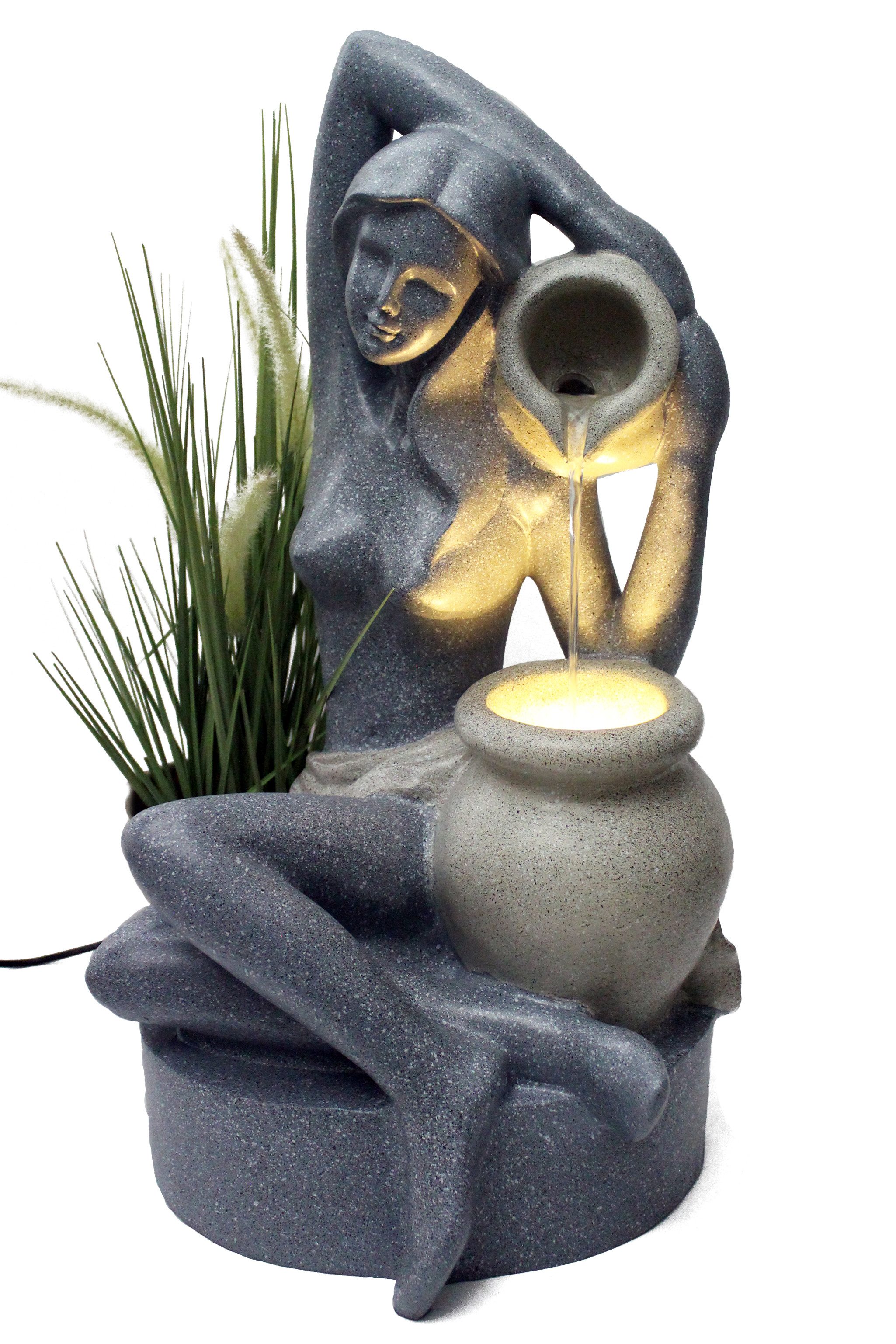 Im Inneren des Springbrunnens befindet sich das Wasserreservoir (ca. 7l). Der Brunnen kann frei aufgestellt werden. Die Pumpe, die sich im Wasserreservoir befindet, pumpt das Wasser in den oberen Krug und fließt dann in den beleuchteten unteren Krug.