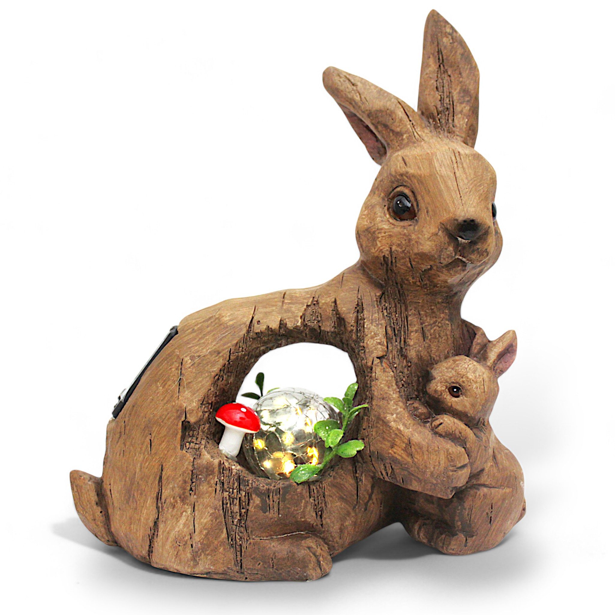 Diese schöne Solar Gartenfigur wurde aus Kunstharz in Holzoptik hergestellt. In der Mitte der Tierfigur befindet sich eine Glaskugel im Bruchdesign, die mit einer Lichterkette gefüllt ist.
