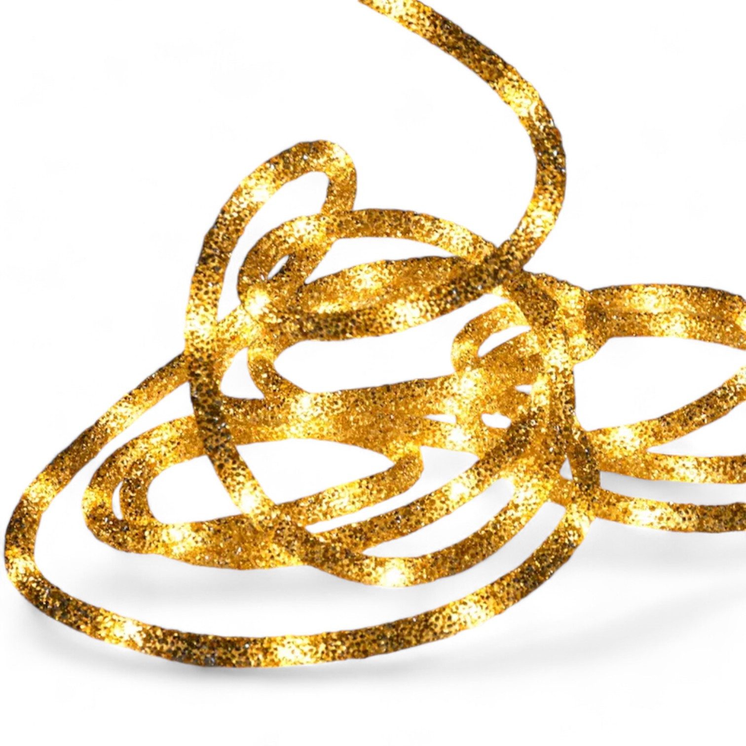Der flexible Lichtschlauch ist 5 Meter lang und ist mit 100 warmweißen LED's ausgestattet. Die Oberfläche ist strukturiert mit Glitzersteinen (ohne abfärben) und goldener Farbe.