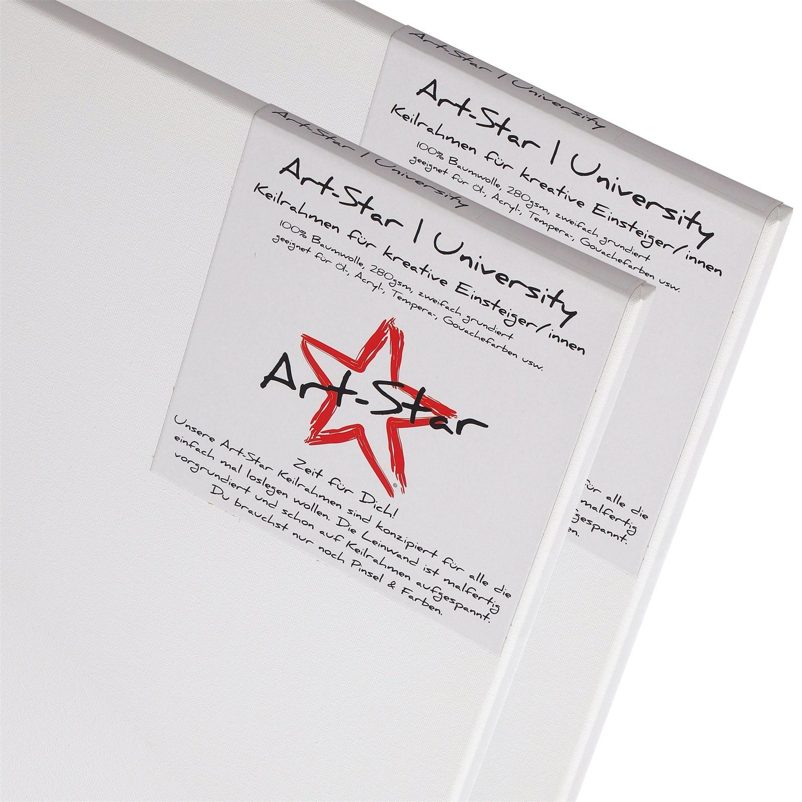 Art-Star University: Bespannte Leinwände auf Keilrahmen in solider Einsteigerqualität. Malfertige bespannte weiße blanko Leinwände auf Keilrahmen | Keilrahmenprofil: 17x26mm (HxB) ab Format 30x60cm und 15x25mm (HxB) bei kleineren Formaten| Leinwandtuch: ±280g/m² 100% Baumwolle | malfertig vorgrundiert | 8 Holzkeile zur individuellen Anpassung der Gewebespannung durch Auskeilen nach Bedarf.