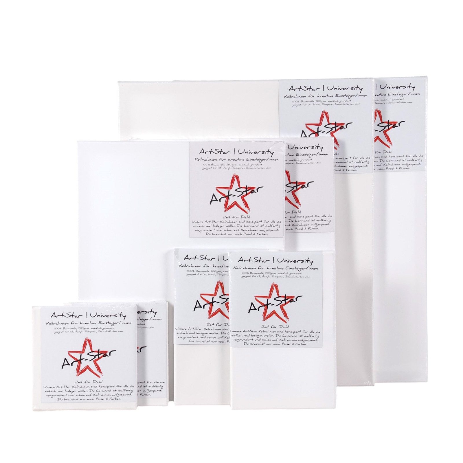 Art-Star University: 2x 20x20 cm / 2x 20x30 cm / 2x 40x50 cm / 2x 50x60 cm. Bespannte Leinwände auf Keilrahmen in solider Einsteigerqualität. Malfertige bespannte weiße blanko Leinwände auf Keilrahmen | Keilrahmenprofil: 17x26mm (HxB) ab Format 30x60cm und 15x25mm (HxB) bei kleineren Formaten| Leinwandtuch: ±280g/m² 100% Baumwolle | malfertig vorgrundiert | 8 Holzkeile zur individuellen Anpassung der Gewebespannung durch Auskeilen nach Bedarf.