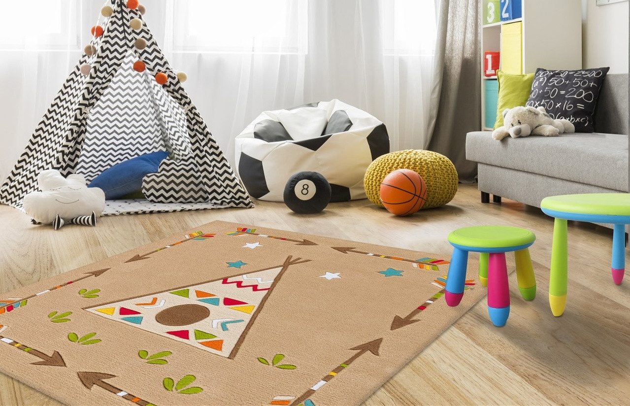 **Kinderteppich mit Leuchtgarn** Dieser kurzflorige Kinderteppich wird zum Blickfang in jedem Kinderzimmer. Das bunte und kindgerechte Design an sich ist bereits ein echter Hingucker. Der Clou besteht in Elementen aus PES-Garn, die fluoreszierend sind und im Dunkeln leuchten. So ist es beim Ausschalten des Lichts nicht direkt vollständig dunkel im Kinderzimmer, denn von dem Kurzflorteppich geht ein leichtes, angenehmes Licht aus. Bringen Sie die Augen Ihrer Kinder zum Strahlen und legen Sie einen Leuchtteppich ins Kinderzimmer. Der weiche Acryl-Flor ist ideal als Spielunterlage geeignet, denn sie ist nicht nur in kindgerechtem Design gehalten, sondern dank des Materials auch äußerst pflegeleicht. Verstärkt wird das Acryl-Material durch einen Rücken aus Polyester und Baumwolle. In Räumen mit Fußbodenheizung kann der Teppich ebenfalls problemlos platziert werden.