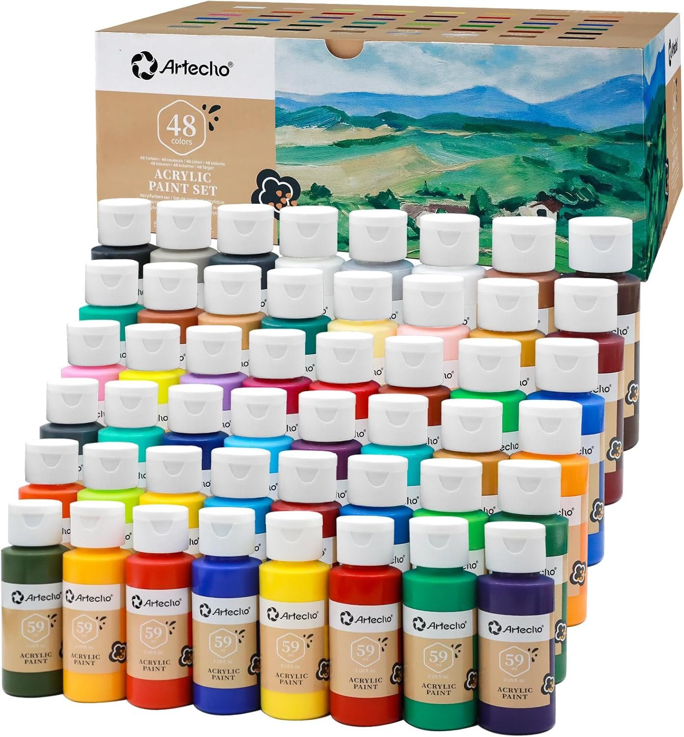 Hauchen Sie Ihren Bildern Leben ein, mit unserem Acrylfarben-Set, bestehend aus 18 / 24 / 48 intensiven, aufeinander abgestimmten Farbtönen, inklusive Metallicfarben.