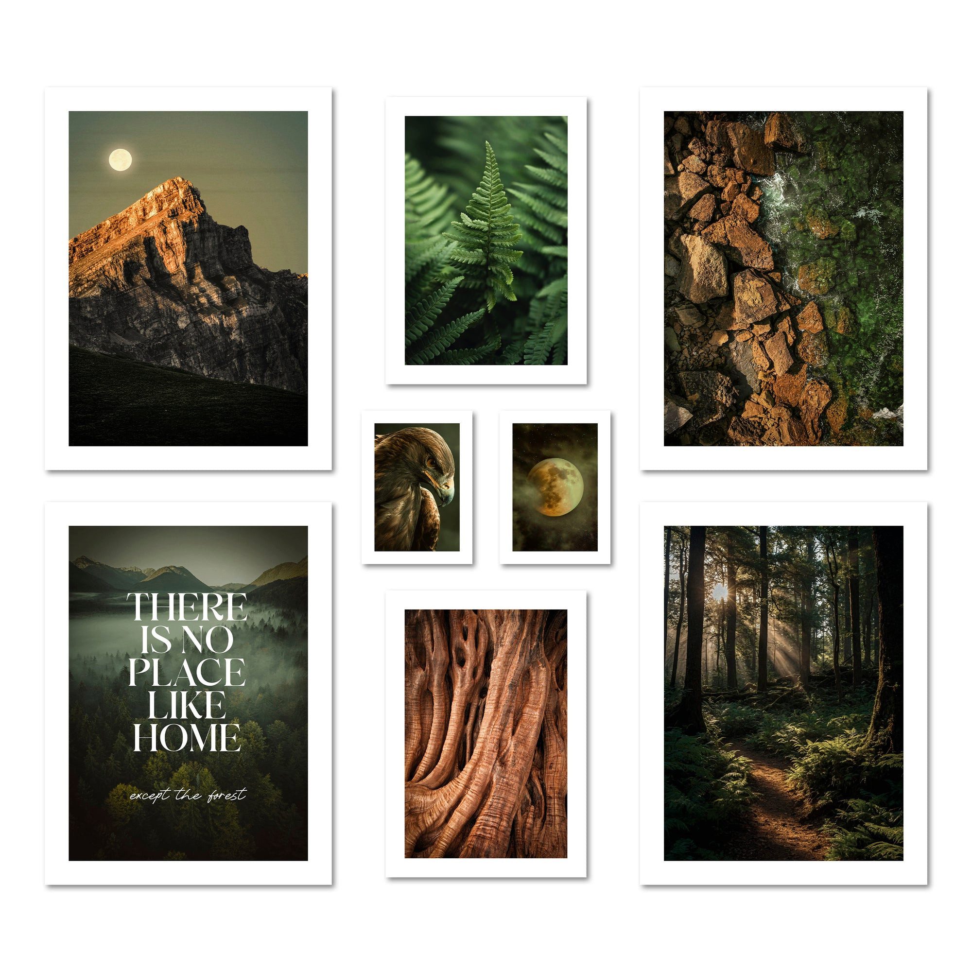 Erlebe die ungezähmte Schönheit der Natur mit dem Poster Set "Wild Forest" und bringe die Magie des Waldes direkt in dein Zuhause. In erdigen Grün- und Brauntönen gehalten, fängt dieses Set die Vielfalt und Ruhe wilder Landschaften ein. Detaillierte Motive wie filigraner Farn, ein dramatisches Meer mit Felsen von oben, geheimnisvoller Mond, das kraftvolle Portrait eines Steinadlers, ein kunstvoll geschwungener Holzstamm, stimmungsvoller Wald im Sonnenuntergang, ein von Mondlicht erleuchteter Berggipfel und ein poetischer Blick auf den Wald von oben mit dem Zitat "there is no place like home, except the forest" laden zum Träumen ein. Diese Wald Poster schaffen im Wohnzimmer, Schlafzimmer oder Home Office eine natürliche Oase voller Ruhe und Inspiration und sind perfekt für alle, die sich nach der ursprünglichen Kraft des Waldes und der Natur sehnen.