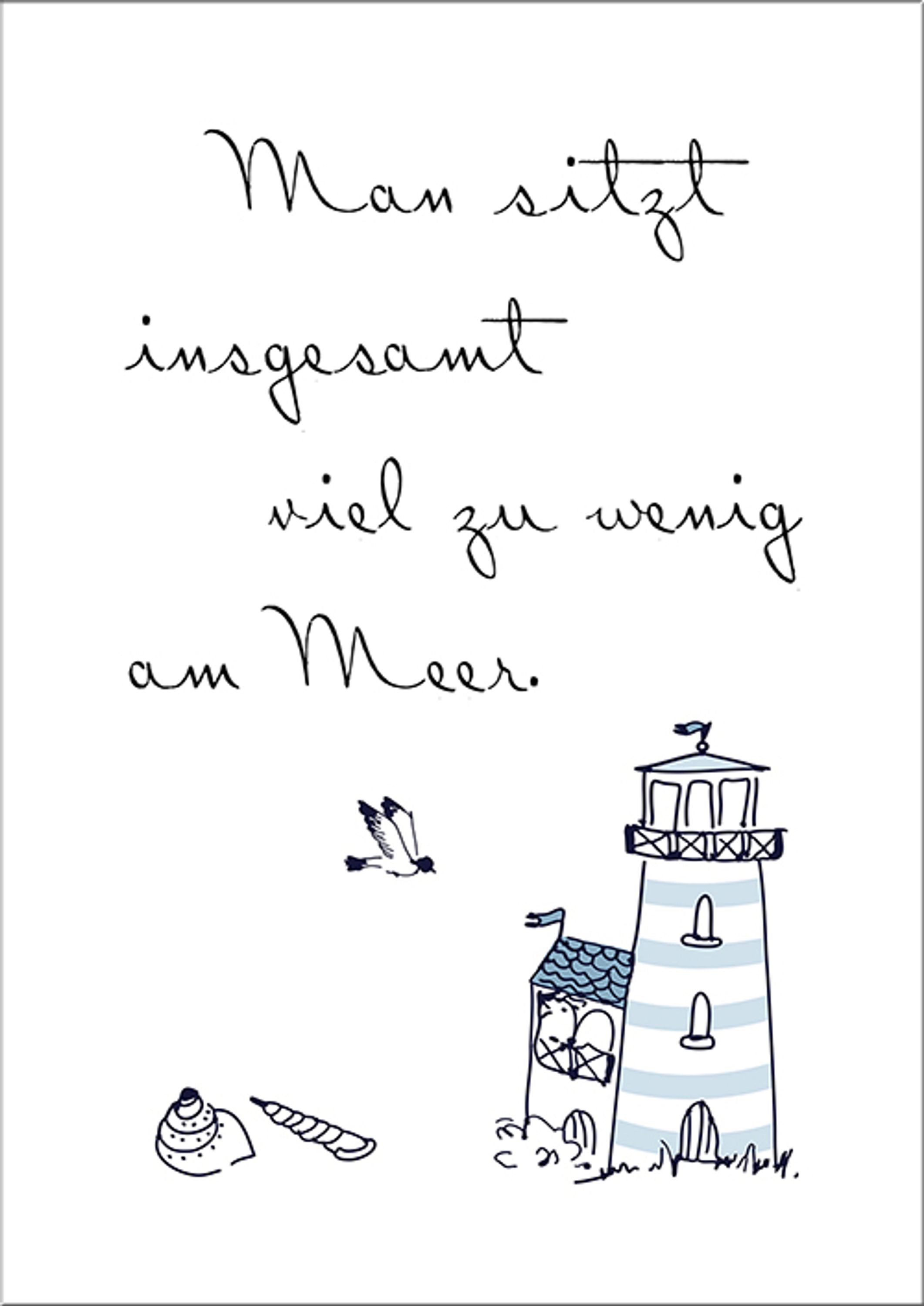 Dieses liebevoll gestaltete Spruchbild „Man sitzt insgesamt viel zu wenig am Meer“ bringt maritimes Urlaubsgefühl direkt nach Hause. Das Deko-Panel wird im hochwertigen Vierfarb-Offsetdruckverfahren auf eine 3 mm starke MDF-Platte aufgebracht und mit UV-Lack veredelt – für brillante, langlebige Farben.