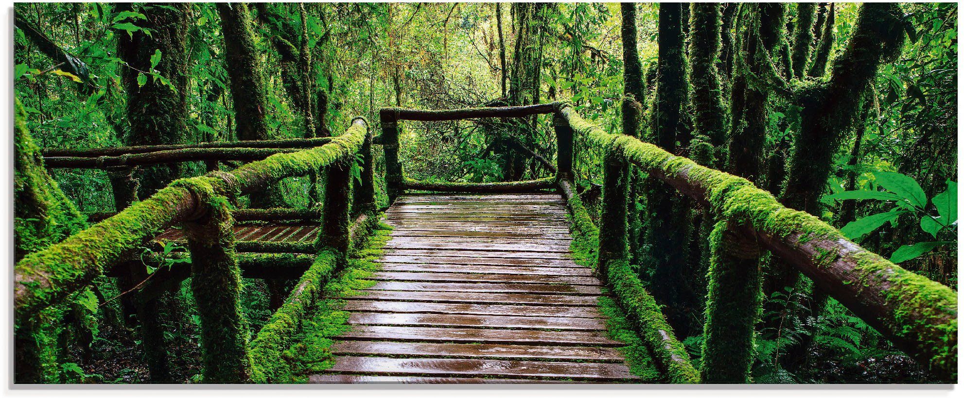 Unser mit Liebe in Handarbeit hergestelltes Glasbild mit dem Motiv "Nasser hölzerner Brückenpfad im immergrünen Wald auf einem Berg nördlich von Thailand" von khunaspix überzeugt durch originalgetreue Druckqualität und hochwertige Basismaterialien. Das Motiv wird Dir wie abgebildet und fertig zum Aufhängen nach Hause geliefert.