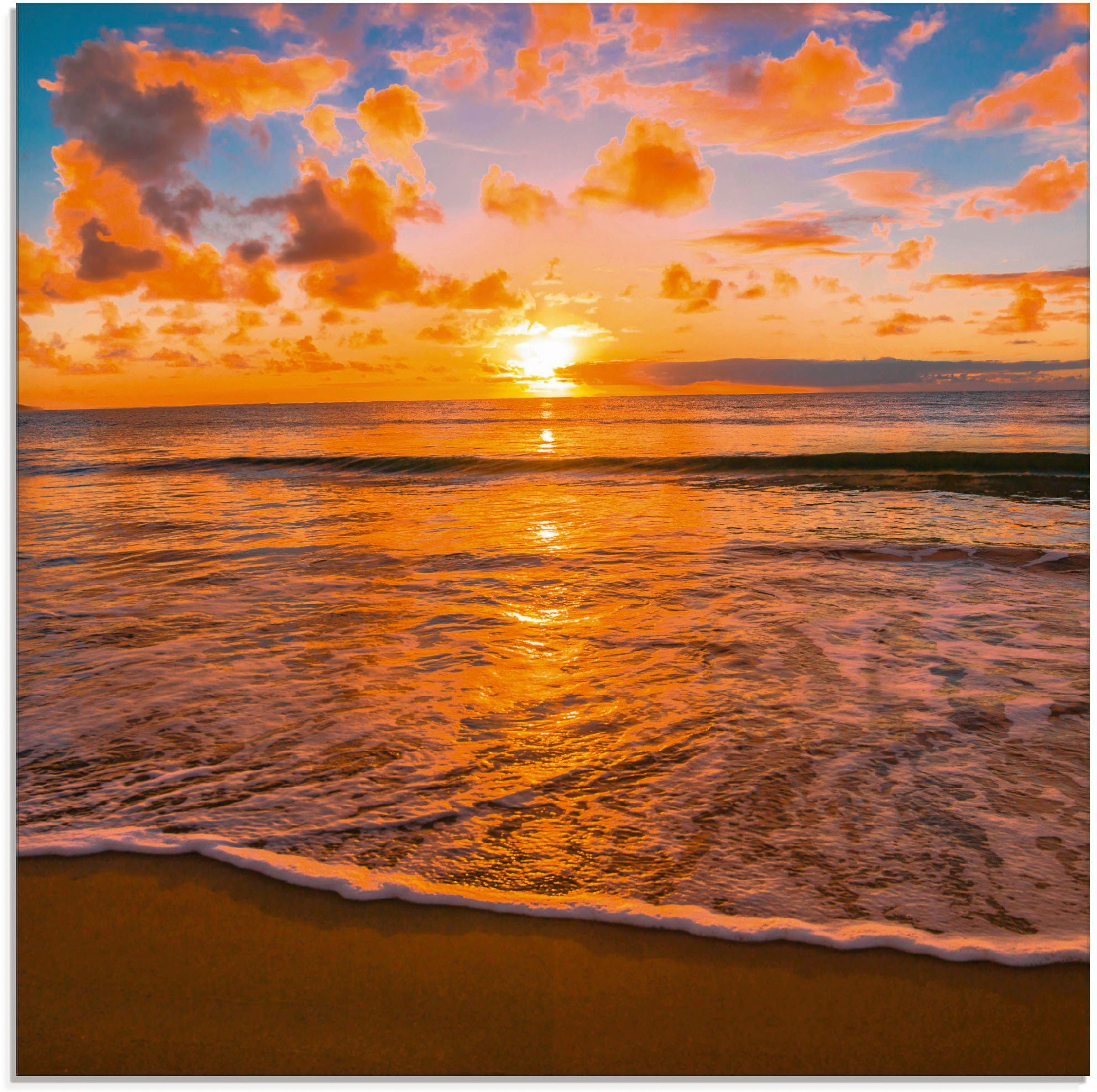 Unser mit Liebe in Handarbeit hergestelltes Glasbild mit dem Motiv "Schöner tropischer Sonnenuntergang am Strand" von Idiz überzeugt durch originalgetreue Druckqualität und hochwertige Basismaterialien. Das Motiv wird Dir wie abgebildet und fertig zum Aufhängen nach Hause geliefert.