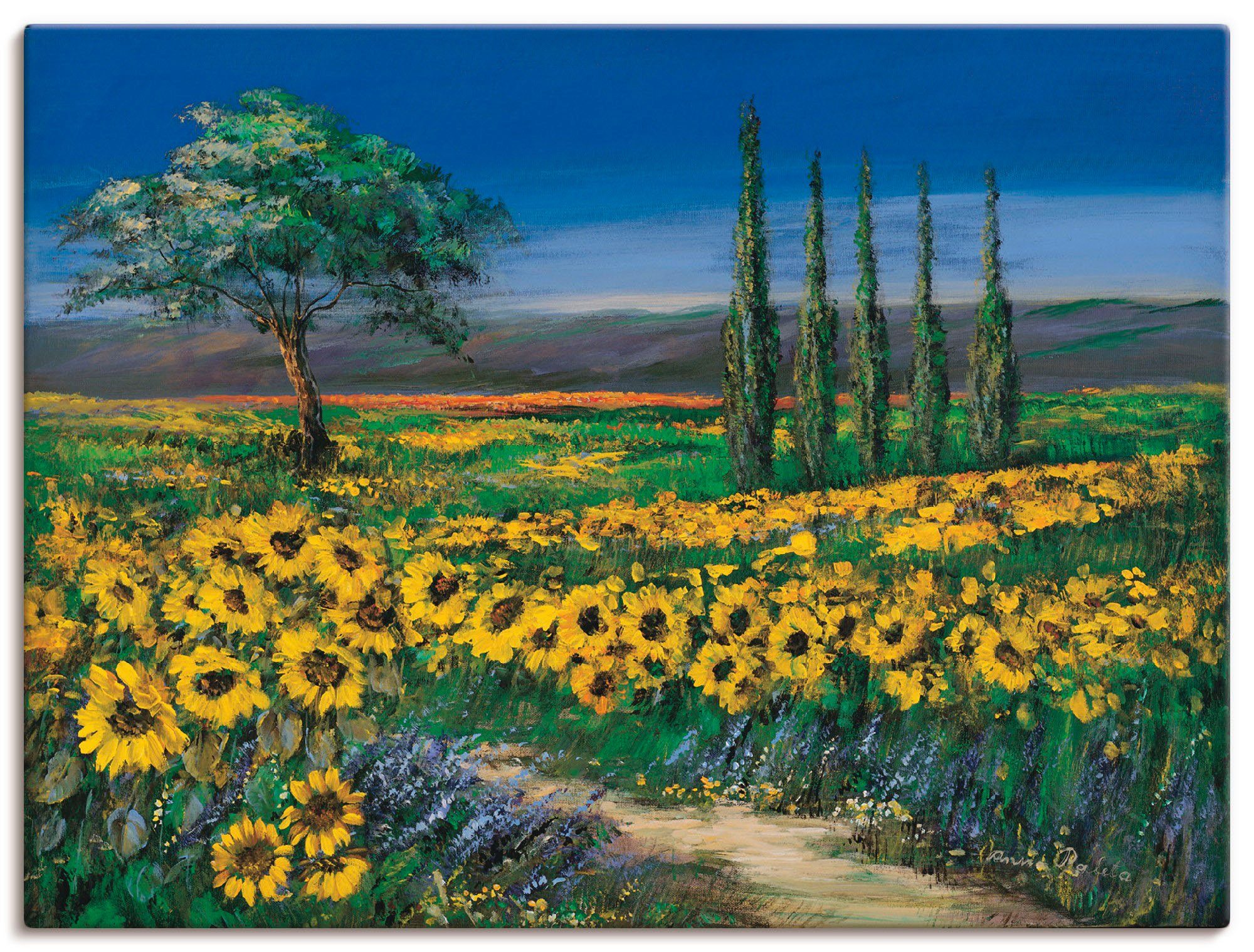 Unser mit Liebe in Handarbeit hergestelltes Leinwandbild mit dem Motiv "Sonnenblumenfeld" von Anna Paleta überzeugt durch originalgetreue Druckqualität und hochwertige Basismaterialien. Das Motiv wird Dir wie abgebildet und fertig zum Aufhängen nach Hause geliefert.