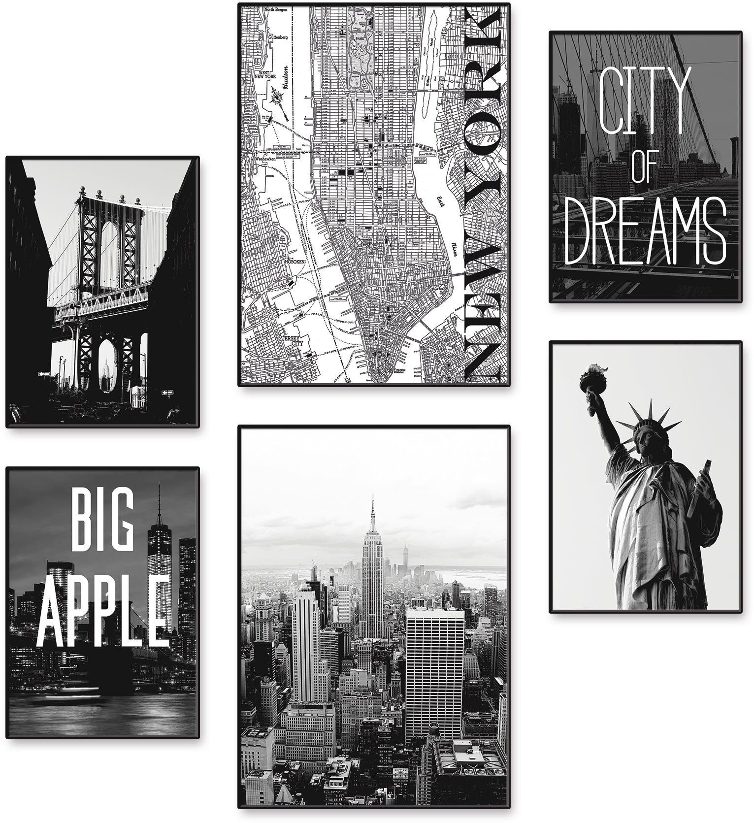 Das Posterset mit dem Titel "Manhattan Bridge. New York Karte. Stadt der Träume. Big Apple. Skyline Manhattan. Freiheitsstatue" von dem Künstler Frederic. Palinchak, M. Jule. Springmeyer. Carl macht eine neue Wandgestaltung in Ihrer Wohnung möglich. Nutzen Sie sie für die Wände im Wohnzimmer, Schlafzimmer oder sonstigen Wohnräumen. Die auf einander abgestimmten Motiven lassen sich einzeln an verschiedenen Wänden oder als Gallery Wall an einer Wand aufhängen. Lassen Sie Ihrer Kreativität einfach freien Lauf! Das hochwertige Premium Papier und das professionelle Druckverfahren sichern Ihnen lange Freude an den Postern im 6er Set. So können Sie sich sicher sein, dass die Motive auch optisch überzeugen und genau wie abgebildet zu Ihnen nach Hause geliefert werden. Bitte beachten Sie, dass das Posterset ohne die abgebildeten Rahmen geliefert wird.