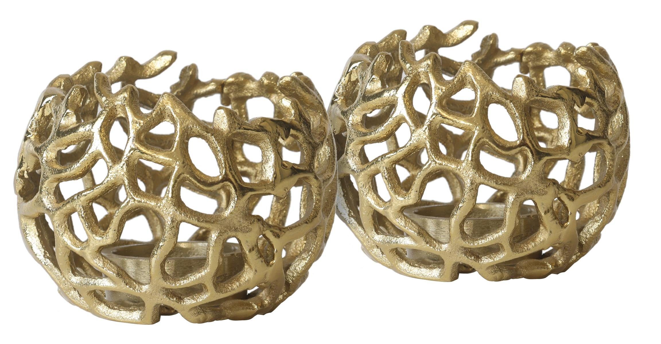 Das Aluminium-Kerzenständer-Set im 2er-Pack, dessen Design an die Form von Korallen erinnert, vereint natürliche Ästhetik mit modernem Stil. Diese beiden Kerzenständer haben eine skulpturale, organische Struktur, die an die verzweigten Formen eines Korallenriffs angelehnt ist. Die filigranen Äste und Verzweigungen sind unregelmäßig geformt, was die dynamische und lebendige Wirkung der Korallen nachahmt und den Eindruck eines natürlichen, gewachsenen Objekts vermittelt.