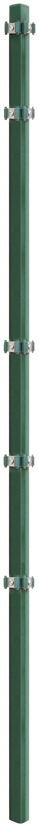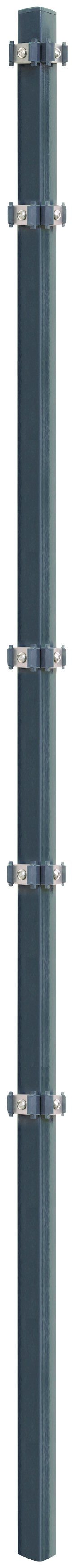 Der Eckpfosten aus verzinktem Metall ist durch Phosphatierung und Pulverbeschichtung optimal gegen Rost geschützt. Er eignet sich für einen klassischen Gartenzaun aus Einzel- oder Doppelstabmatten und wird inklusive Halterungen und Befestigungsmaterial geliefert.