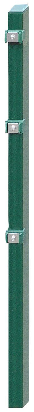 Der Eckpfosten aus verzinktem Metall ist durch Phosphatierung und Pulverbeschichtung optimal gegen Rost geschützt. Er eignet sich für einen klassischen Gartenzaun aus Einzel- oder Doppelstabmatten und wird inklusive Halterungen und Befestigungsmaterial geliefert.