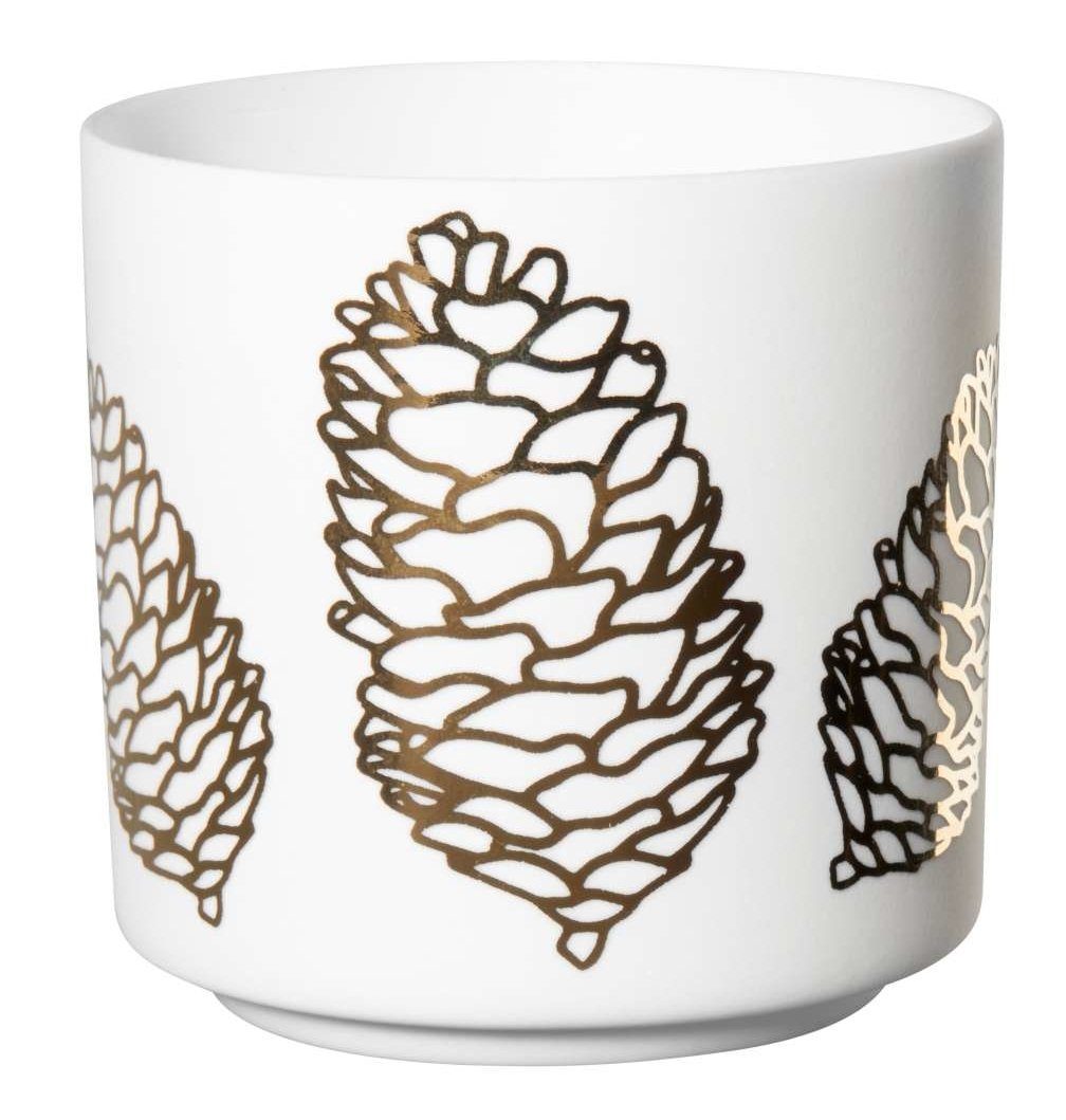 Das schöne Windlicht mit dem goldenen Pinien drauf, sieht mit einem Teelicht darin sehr schön aus und wirft ein tolles Licht in den Raum.