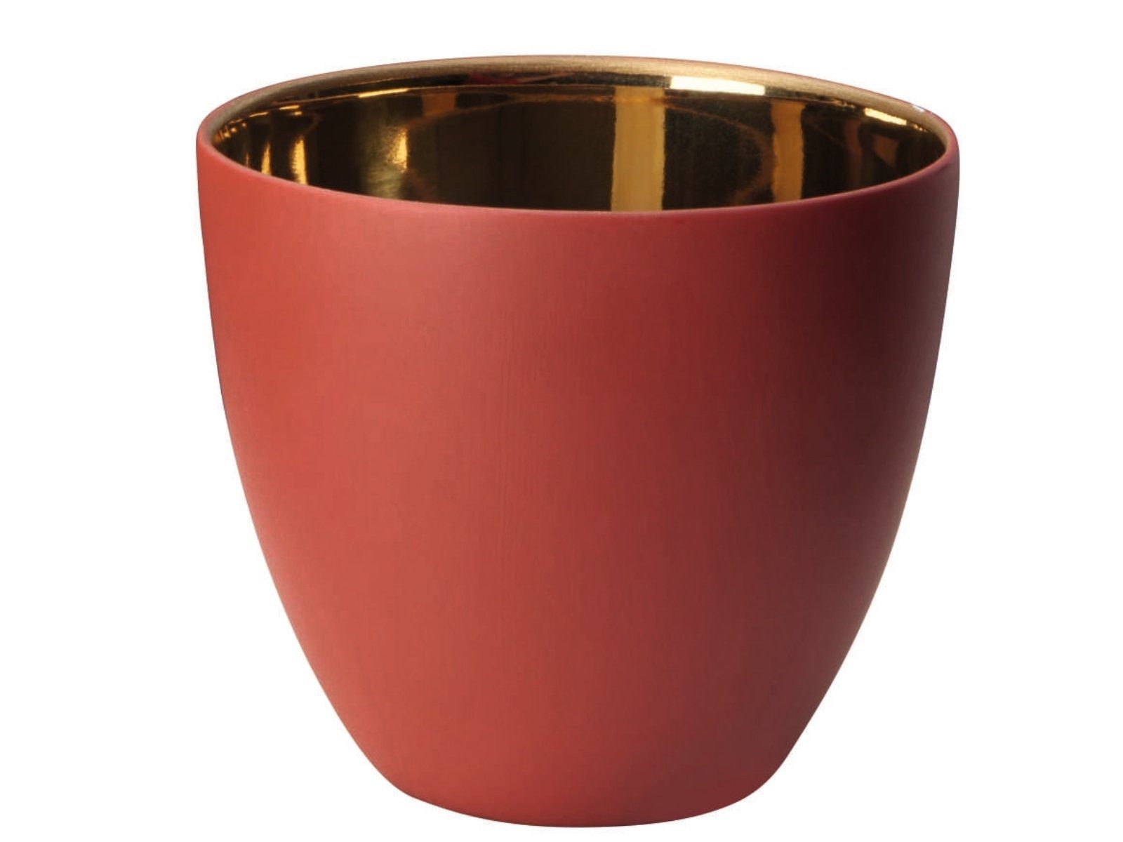 Das schlichte Windlicht strahlt durch seine Innenseite aus glänzendem gold ein warmes Licht aus welches zum enstpannen einlädt.
