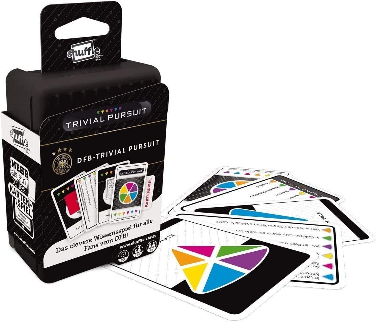 Mit verschiedene Ausführungen. Marke: ASS Shuffle - DFB Trivial Pursuit. Das clevere Wissensspiel für alle Fußballfans In diesem interaktiven Quizspiel findet man Antworten auf Fragen, die Fußballfans schon immer interessiert haben. Ziel des Spiels ist es, als erster Spieler mindestens eine Frage aus allen sechs Wissenskategorien zu beantworten. In der DFB-Edition werden Themen rund um den Deutschen Fußball-Bund behandelt. Ob Fragen zur WM 2018, zum Frauenfußball, zu den deutschen Nationalspielerinnen und Nationalspielern, zum DFB-Pokal, zur Historie des DFB oder zu den Welt- und Europameisterschaften – das knifflige DFB-Quizspiel wird für alle Fans eine kleine Herausforderung. Inhalt: 110 Karten im Format 56 x 87 mm Shuffle - DFB Trivial Pursuit, ein Spiel für 2 bis 4 Spieler im Alter von 12 bis 100 Jahren.Schneller Kartenspaß beim Austeilen und Einheimsen! Mit dem Shuffle DFB-Monopoly Deal kann man alle Höhen und Tiefen, die eine Partie MONOPOLY mit sich bringt, in gerade einmal 20 Minuten erleben. Ähnlich wie beim Klassiker gilt es, drei Kartensätze zu sammeln, um zu gewinnen. In der DFB-Варианты sind dies Teamsätze mit den Spielern und Trainern der Nationalmannschaft. Mit Taktik- oder Technikkarten können die Fähigkeiten und somit der Wert des Teamsatzes erhöht werden. Aber Achtung – die passenden DFB-Spieler können einem jederzeit von den Mitspielern vor der Nase weggeschnappt werden. Kartenformat: 56 x 87 mm Shuffle - DFB Monopoly Deal, ein Spiel für 2 bis 4 Spieler im Alter von 12 bis 100 Jahren
