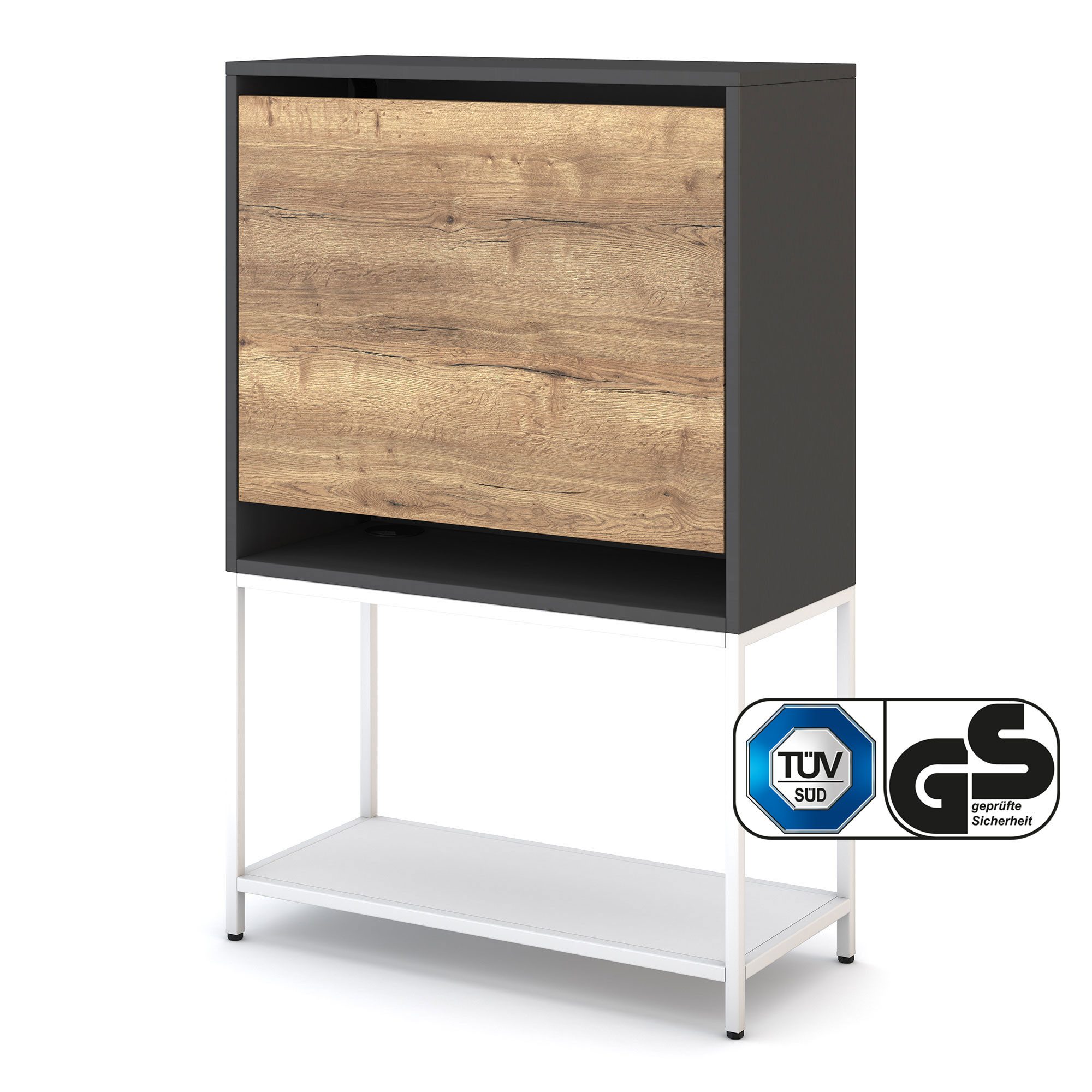 Dank robustem Metallkorpus steht der Sekretär stabil und sicher. Die kratzfeste Oberfläche ist langlebig und pflegeleicht. Ein Highlight ist die Blende in Holzoptik, die dem Möbelstück eine warme, wohnliche Note verleiht.