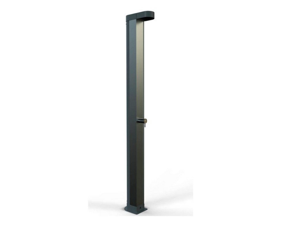 Tank und Dusche aus beschichtetem Aluminium (RAL7021) und Kunststoff. Duschkopf mit Anti-Kalk Funktion, reduziert die Ablagerung von Kalk. Inklusive Schnellanschluss für Wasserzulauf (kalt) und Ablasshahn zur Entleerung. Die Bodenbefestigung erfolgt mittels Verankerungsschrauben und Dübeln (im Lieferumfang enthalten). Höhe ca. 2,1 m.