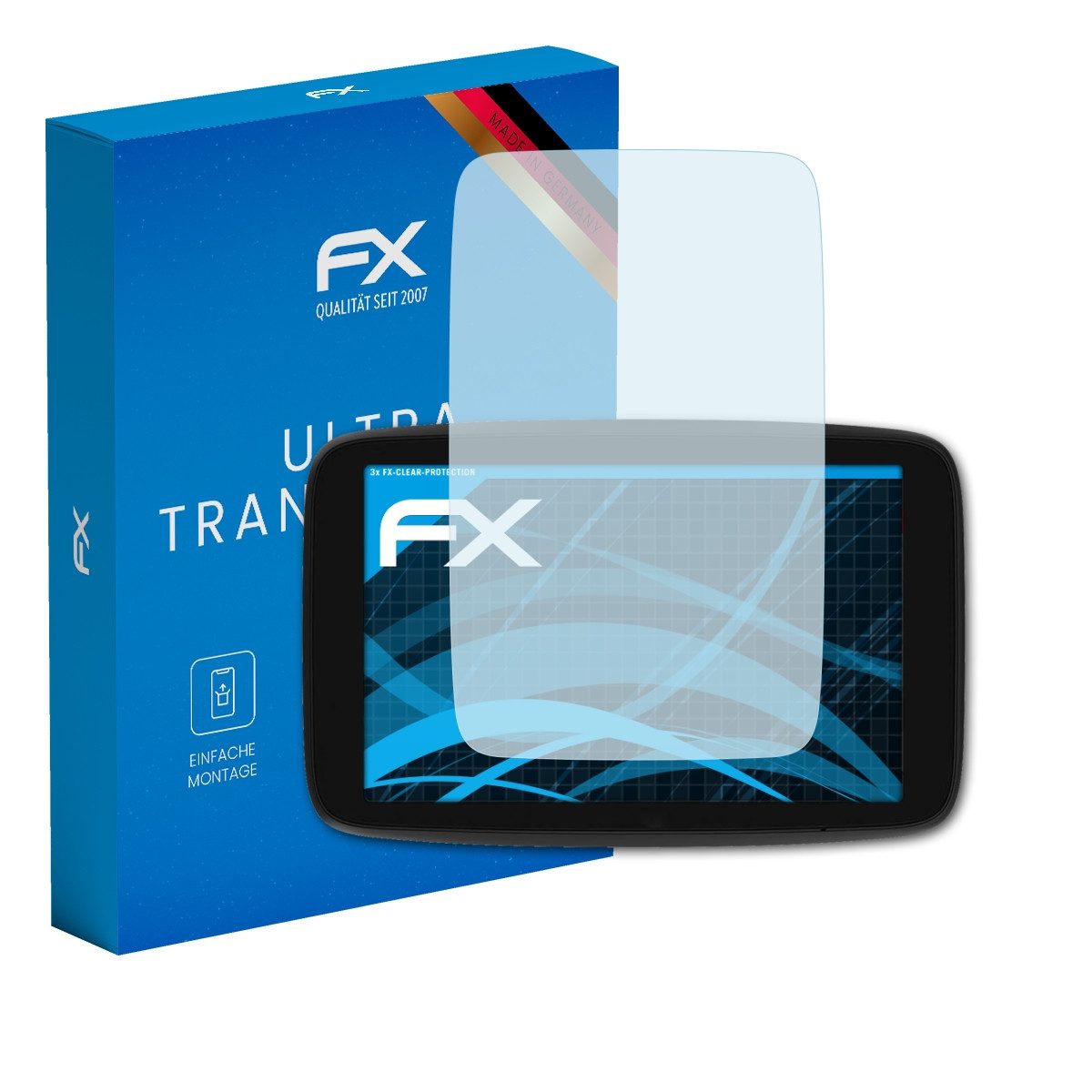 Lieferumfang | 3 x FX-Clear Folie kompatibel mit TomTom GO Exclusive, Reinigungstuch, Montagewerkzeug (Rakel), Link zur mehrsprachigen, bebilderten Montageanleitung (inkl. Montagevideo), Bei Geräten mit mehreren Displays (z.B. Innen- und Außendisplay), ist für jedes Display eine Schutzfolie in der Verpackung enthalten. |