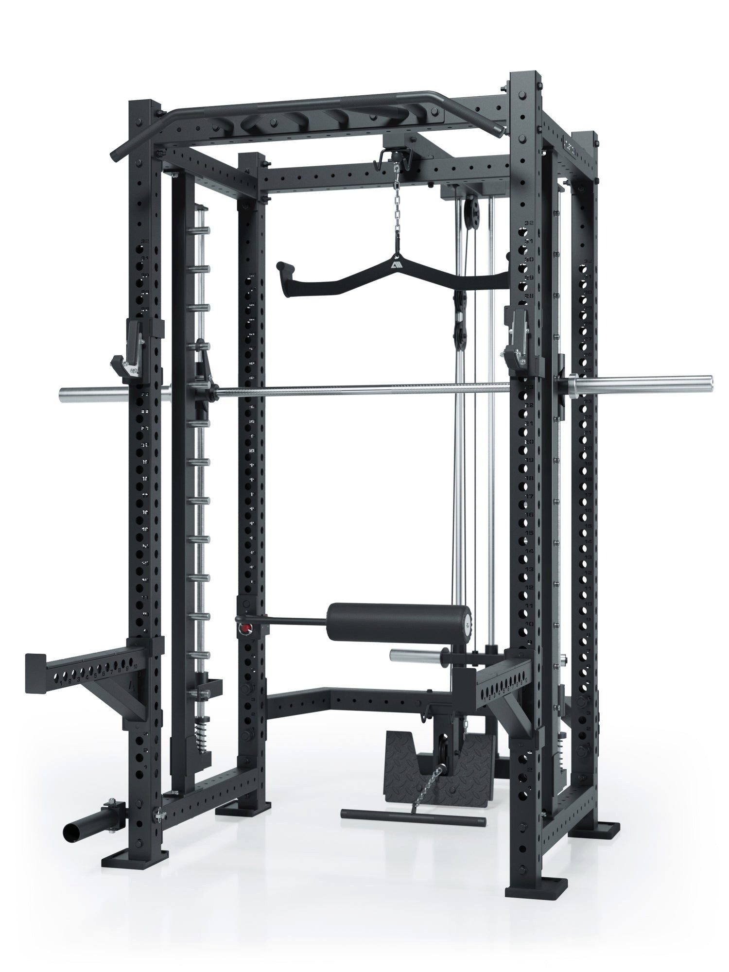 Drei Studiogeräten in einem: Power Rack, Smith Machine und Plate Loaded Lat-/Ruderzug