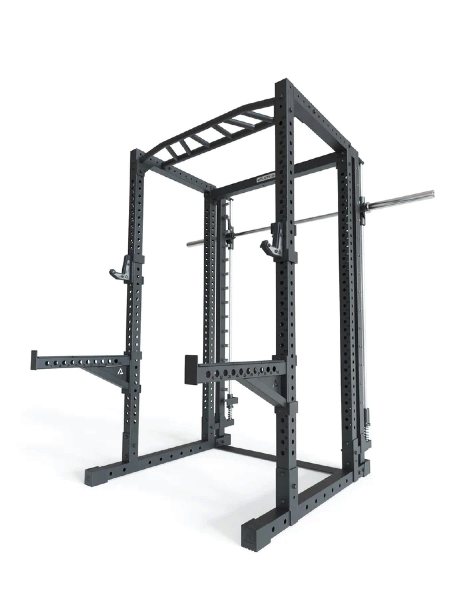 Power Cage mit einer Smith Machine an den hinteren Pfosten