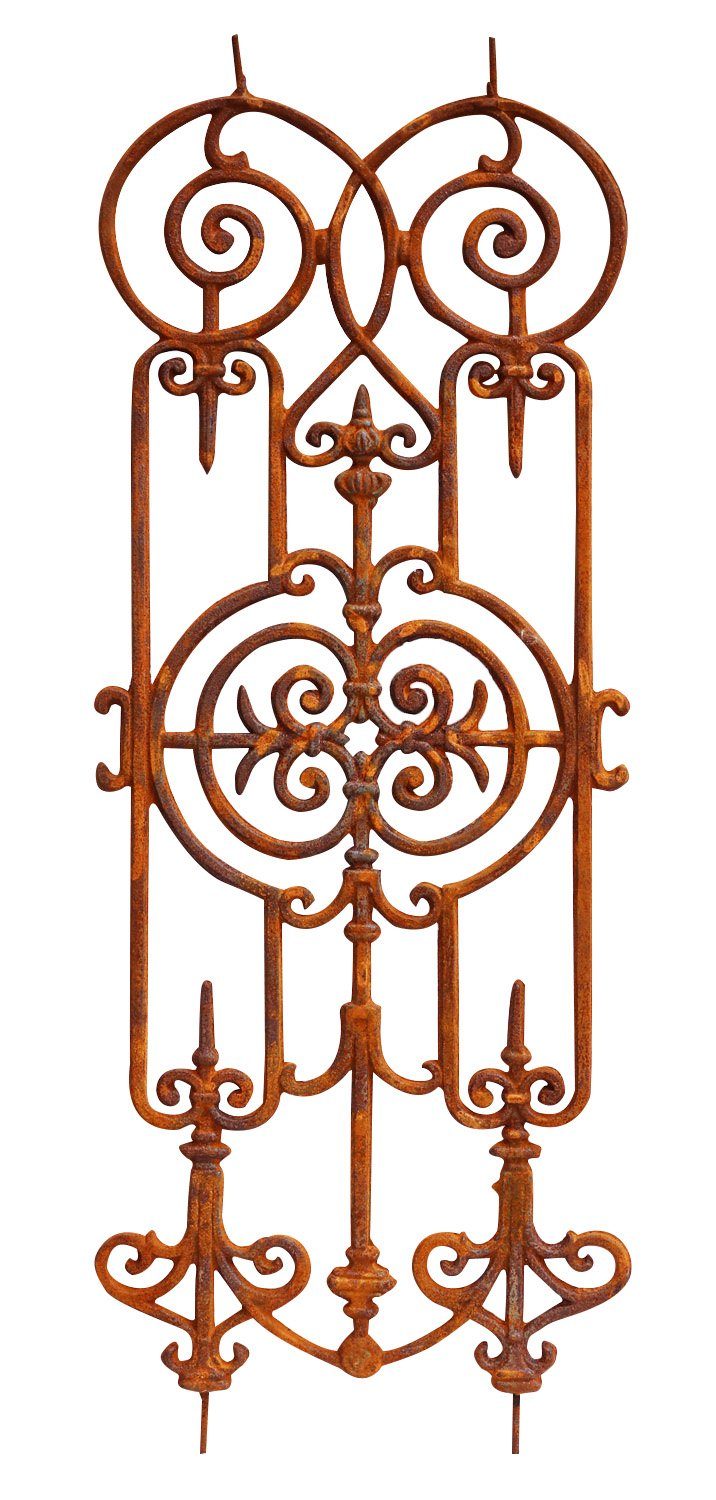 Wunderschönes Gitter, nach historischem Vorbild aus Gusseisen gefertigt. Es ist für die verschiedensten Zwecke geeignet. Zum Beispiel wäre es passend für alte Gebäude wie Balkone, Scheunen, Gartenhütten oder Mauern. Als Zaun könnte man es ebenfalls nutzen und natürlich eignet sich das schöne Stück auch zur Dekoration. Der Rost ist vorhanden, um dem Gitter den antiken Charme zu verleihen. Sollte das Rostfinish nicht zu Ihrem Verwendungsort passen, können Sie das Gitter in der gewünschten Farbe lackieren. Dazu müssen Sie es etwas abschleifen und dann mit einem passenden Lack streichen. Es gibt also unzählige Möglichkeiten, wie Sie das dekorative Gitter in Szene setzen können. Die Maße lauten wie folgt: 36,5 x 88 x 2cm (B x H x T), gemessen ohne die seitlichen Mauerzapfen (Maße der Zapfen: 4,5cm), diese können bei Nichtgebrauch auch abgesägt werden. Das Gewicht beträgt 9kg. Lieber Kunde, herzlichen Dank für die tollen Fotos von Ihrem Gartenprojekt. Sieht klasse aus :-) Respekt dafür.