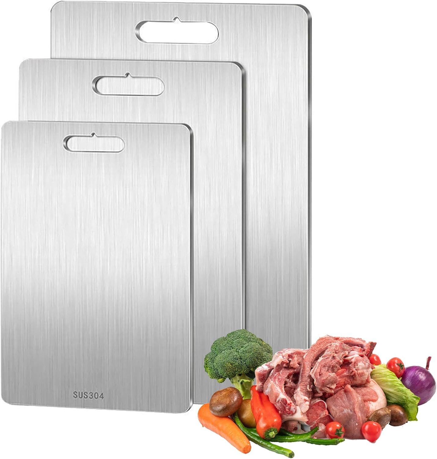 LEBENSMITTELECHTES MATERIAL: Unsere Schneidebretter sind aus hochwertigem 304er Edelstahl, 100% sicher für den Kontakt mit Lebensmitteln, verletzen die Messer nicht und sind geräuscharm. Im Vergleich zu traditionellen Holzmaterialien, Metall Schneidebretter nicht knacken, nicht produzieren Krümel, nicht nass und schimmelig werden, und nicht emittieren unangenehmen Geruch.