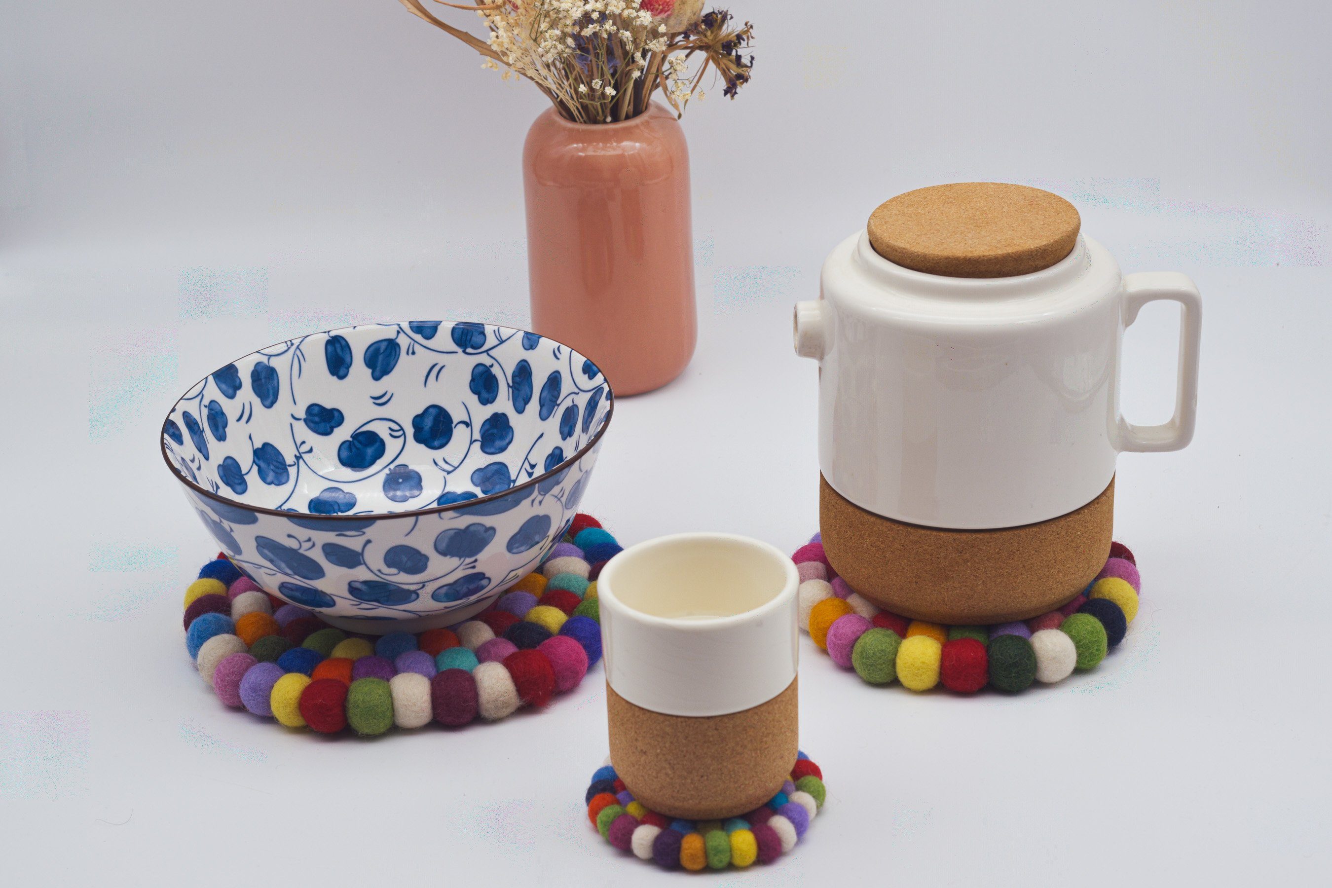 Verleihen Sie Ihrem Zuhause einen Hauch von Farbe und Gemütlichkeit mit unseren bunten Filzkugeluntersetzern! Diese einzigartigen Untersetzer aus Filz sind nicht nur funktional, sondern auch dekorativ. Die Untersetzer sind ein reines Naturprodukt aus 100 % neuseeländischer Schafswolle und werden in Nepal nach fair-trade Kriterien per Hand hergestellt. Die Filzuntersetzer sind von Natur aus wasser- und schmutzabweisend sowie hitzebeständig und bieten eine zuverlässige Schutzschicht für Ihre Tischoberflächen. Egal, ob Sie heiße Tassen, Gläser oder Vasen abstellen möchten, die weiche und dämpfende Wirkung der Filzkugeln schützt vor Kratzern und Abdrücken. Was diese Untersetzer wirklich besonders macht, ist ihre lebendige Farbvielfalt. Jeder Untersetzer besteht aus einer Reihe von Filzkugeln in verschiedenen Farben, die zusammen ein fröhliches Muster bilden. Dies verleiht Ihrem Tisch eine lebendige Note und setzt einen fröhlichen Akzent in Ihrem Zuhause. Die Filzkugeluntersetzer sind nicht nur praktisch für den Alltag, sondern eignen sich auch perfekt für besondere Anlässe oder als Geschenk. Sie bringen Farbe und Freude auf jede Tafel und schaffen eine einladende Atmosphäre für Ihre Gäste. Die Untersetzer sind einfach zu reinigen und langlebig. Bei Bedarf können sie mit einem feuchten Tuch abgewischt oder von Hand gewaschen werden, um ihre Schönheit zu erhalten. Bringen Sie Farbe und Freude in Ihr Zuhause mit unseren bunten Filzkugeluntersetzern und verwandeln Sie Ihren Tisch in einen Blickfang!