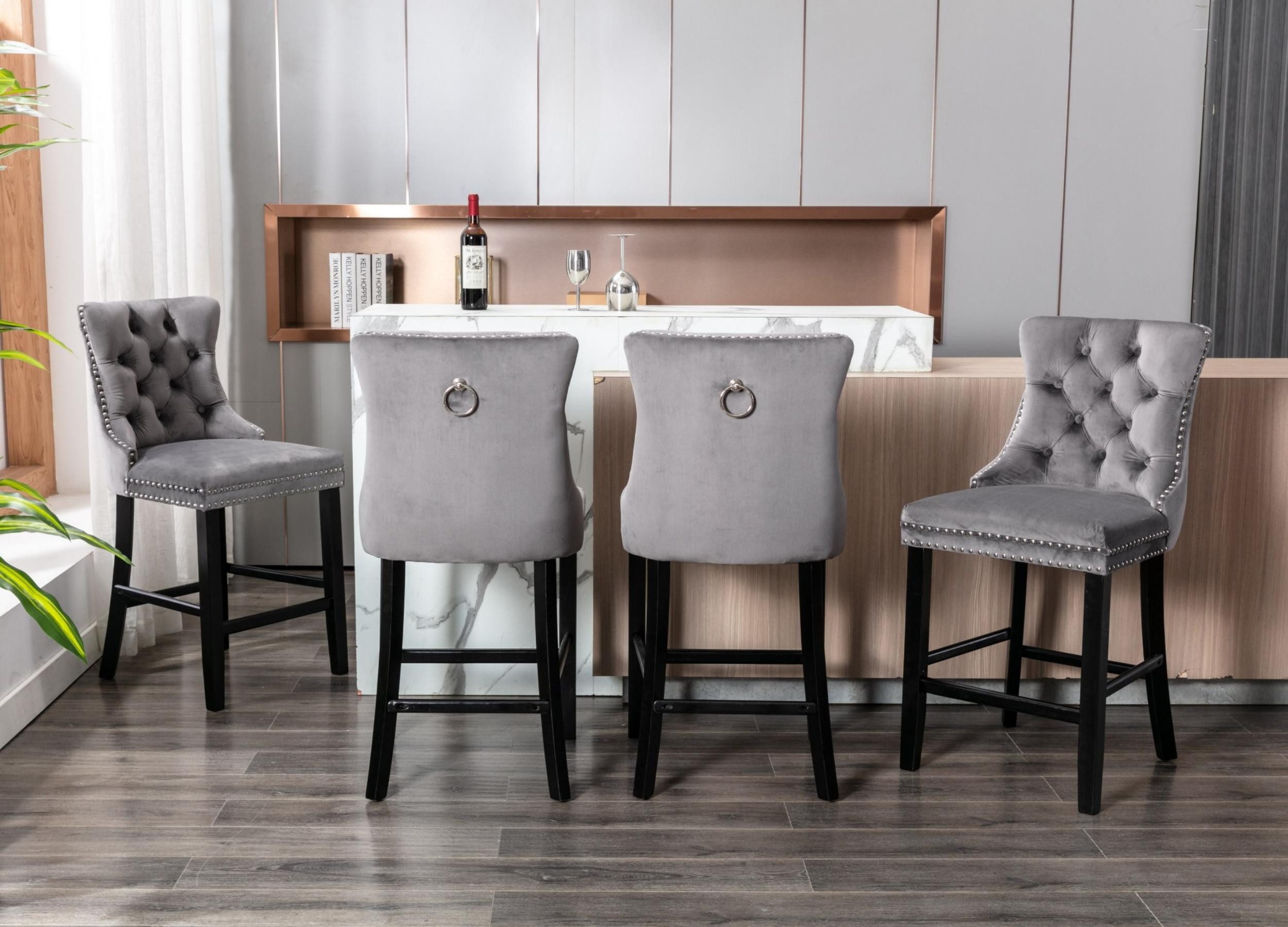 Die Sitzfläche ist mit hochdichtem Schaumstoff und einem Federkern ausgestattet, sodass Sie stets angenehm und bequem sitzen. Die hohe Rückenlehne bietet zusätzlichen Halt und sorgt für ein komfortables Sitzerlebnis. Dekorative Nieten an Sitz und Lehne sowie der elegante Stoffbezug verleihen dem Stuhl eine luxuriöse Ausstrahlung, die Ihr Esszimmer, Wohnzimmer oder Apartment stilvoll aufwertet.