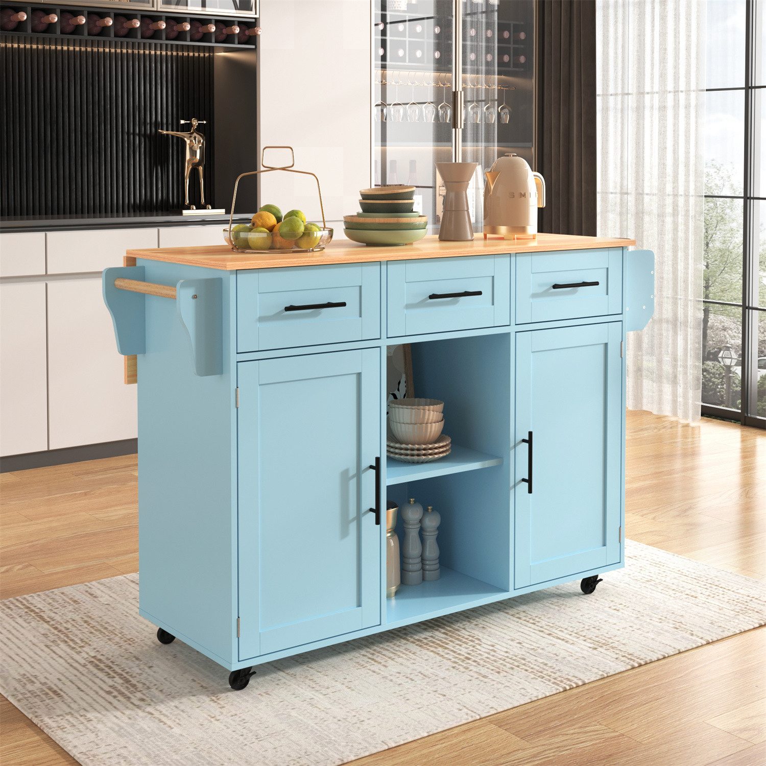 Es verfügt über eine große Tischplatte; die Kücheninsel kann zum Zubereiten von Mahlzeiten oder als Esstisch verwendet werden. Außerdem kann die abklappbare Tischplatte zusätzlichen Platz sparen, wenn sie nicht benötigt wird. Die Tischplatte und die abklappbare Platte sind durch einen Metallrahmen g