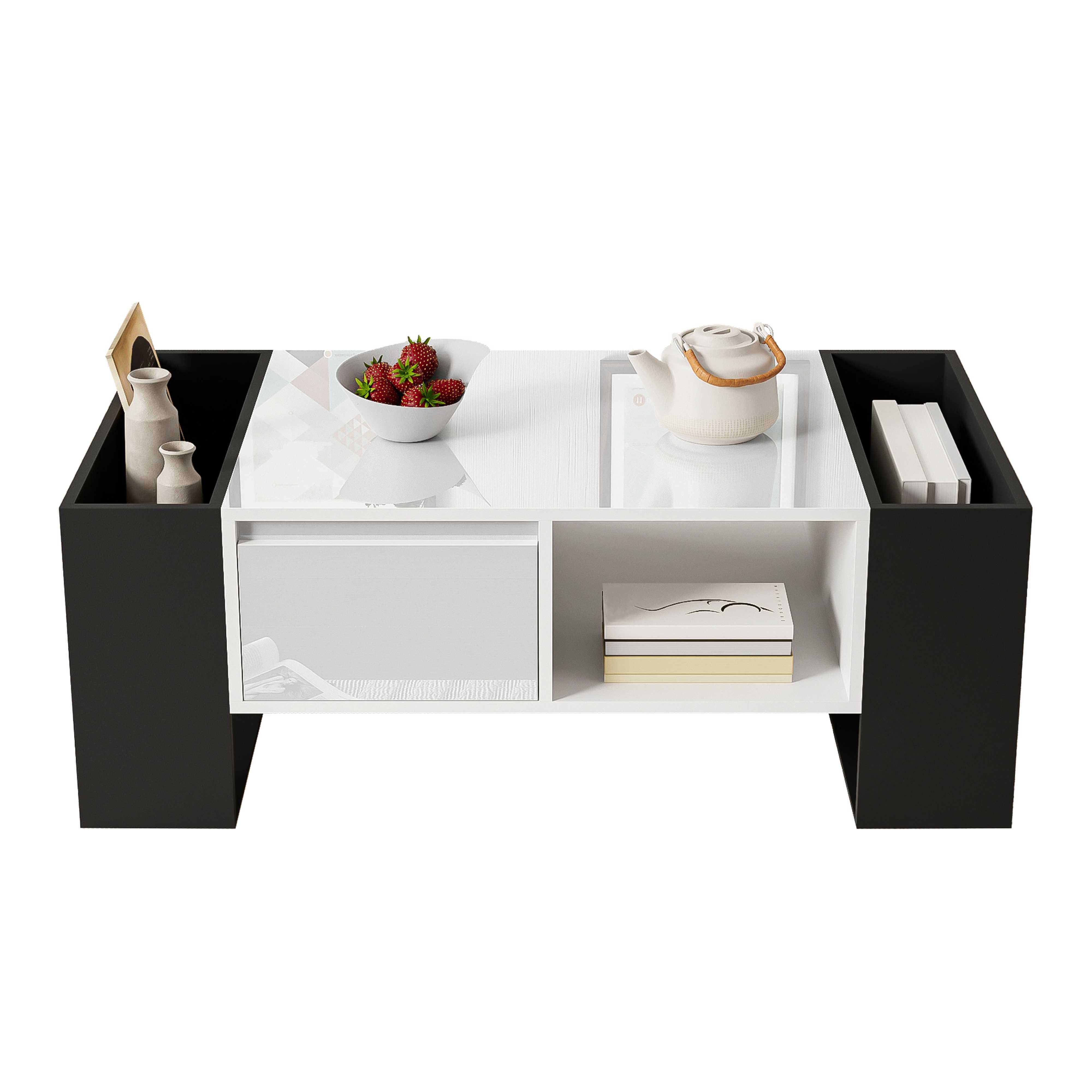 Gefertigt aus robuster Spanplatte mit pflegeleichter Melaminbeschichtung, vereint das Möbelstück Stabilität und einfache Reinigung. Die massiven Holzfüße verleihen dem Couchtisch nicht nur Stabilität, sondern auch einen stilvollen Charakter.