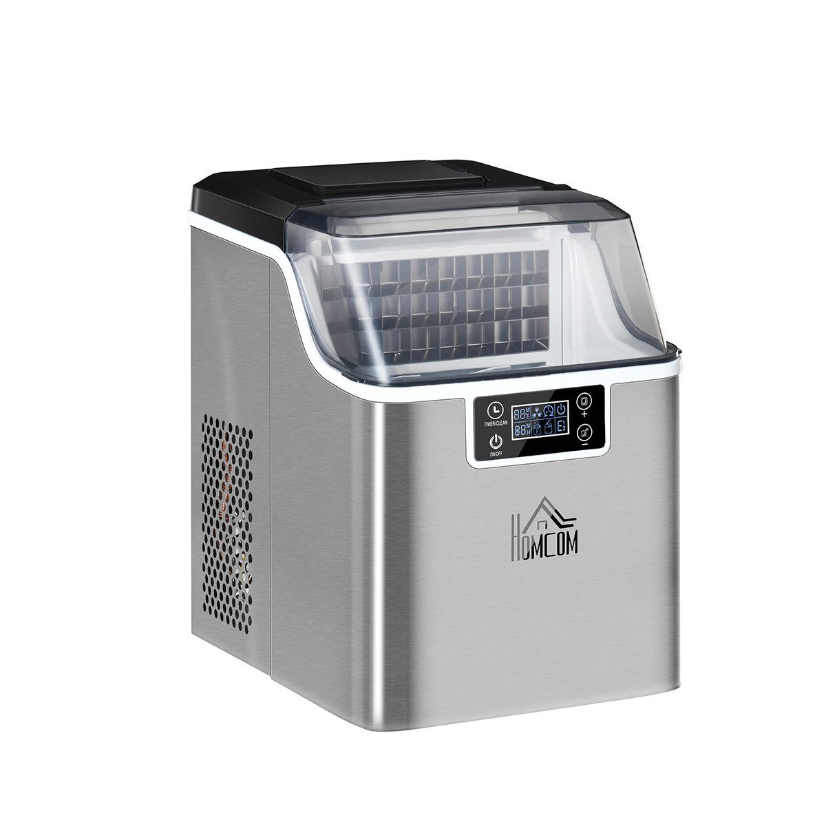 Timer und automatische Reinigung: Bei unserer Eiswürfelmaschine können Sie den Timer durch Drücken der Taste TIMER/CLEAN ein- und ausschalten und ein 20-minütiges automatisches Reinigungsprogramm aktivieren, indem Sie dieselbe Taste länger als 5 Sekunden gedrückt halten. Über den Ablaufstopfen an der Unterseite kann nicht verwendetes Wasser einfach abgelassen werden. Komfortable und zeitsparende Funktionen auf Knopfdruck