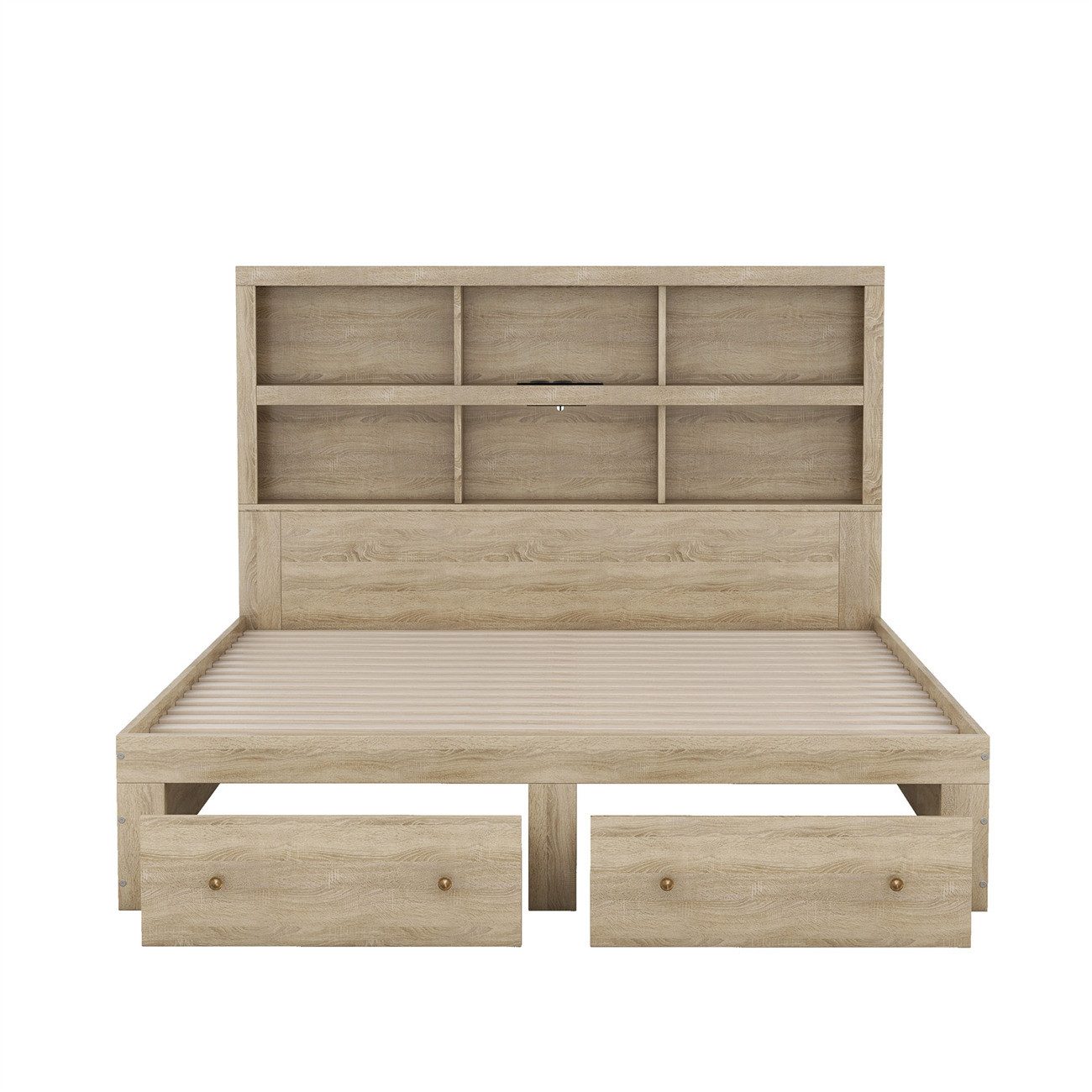 Die Einfachheit dieses Holzbettes mit Stauraum wird Ihr Zimmer beeindrucken. Mit einem modernen Look und minimalistischen Stil, kombiniert dieses Bett Mode und Funktionalität. Es verfügt über 6 Ablagefächer am Kopfteil, in denen Sie Dekorationen oder Bücher, die Sie gerne vor dem Schlafengehen lesen, aufbewahren können. Darüber hinaus verfügt es über einen USB-Ladeanschluss zum einfachen Aufladen von Handys und anderen elektronischen Geräten. Außerdem verfügt es über 2 Schubladen am Ende des Bettes,die zur Aufbewahrung von Ersatzlaken, sauberer Kleidung, Spielkonsolen usw. genutzt werden können. Das Bett ist aus Kiefernholz gefertigt und wird mit Sicherheit den Test der Zeit bestehen. Die warme Farbe des Holzes wird Ihnen zu einem ruhigen Schlaf verhelfen!