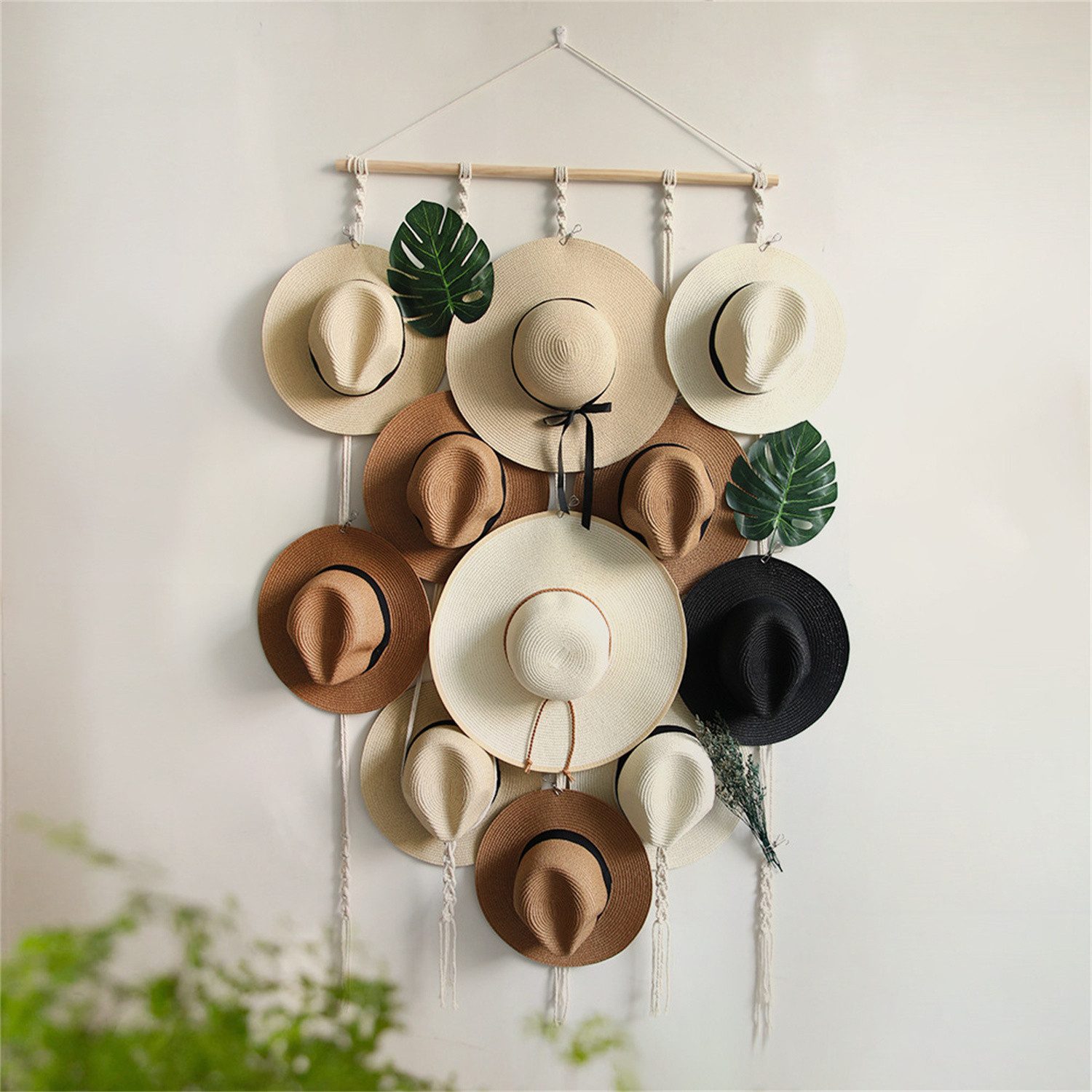 Unser Hut-Organisator für die Wand ist aus natürlicher Baumwollschnur und starkem Holzstab gefertigt. Das handgeflochtene Seil mit dekorativen Quasten am Ende verleiht der Hutablage einen böhmischen Stil. Perfekt für die Aufbewahrung und Präsentation aller Arten von Hüten - Sonnenhüte, Fischerhüte, Baseballkappen, Bowler, Fedora-Hüte und vieles mehr.