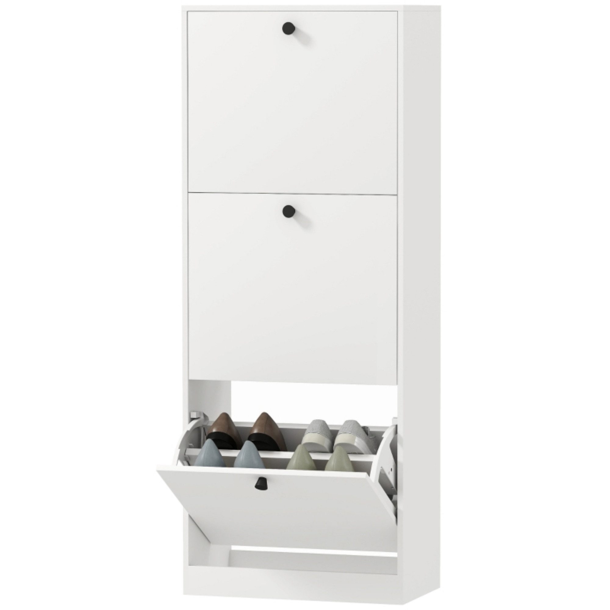 Die drei Klappenfächer bieten Platz für bis zu 12 Paar Schuhe. Jede Klappe ist mit einer dreifach höhenverstellbaren Trennwand ausgestattet, sodass Sie die Fächer flexibel an verschiedene Schuhtypen anpassen können – von Sneakers bis zu Halbschuhen.