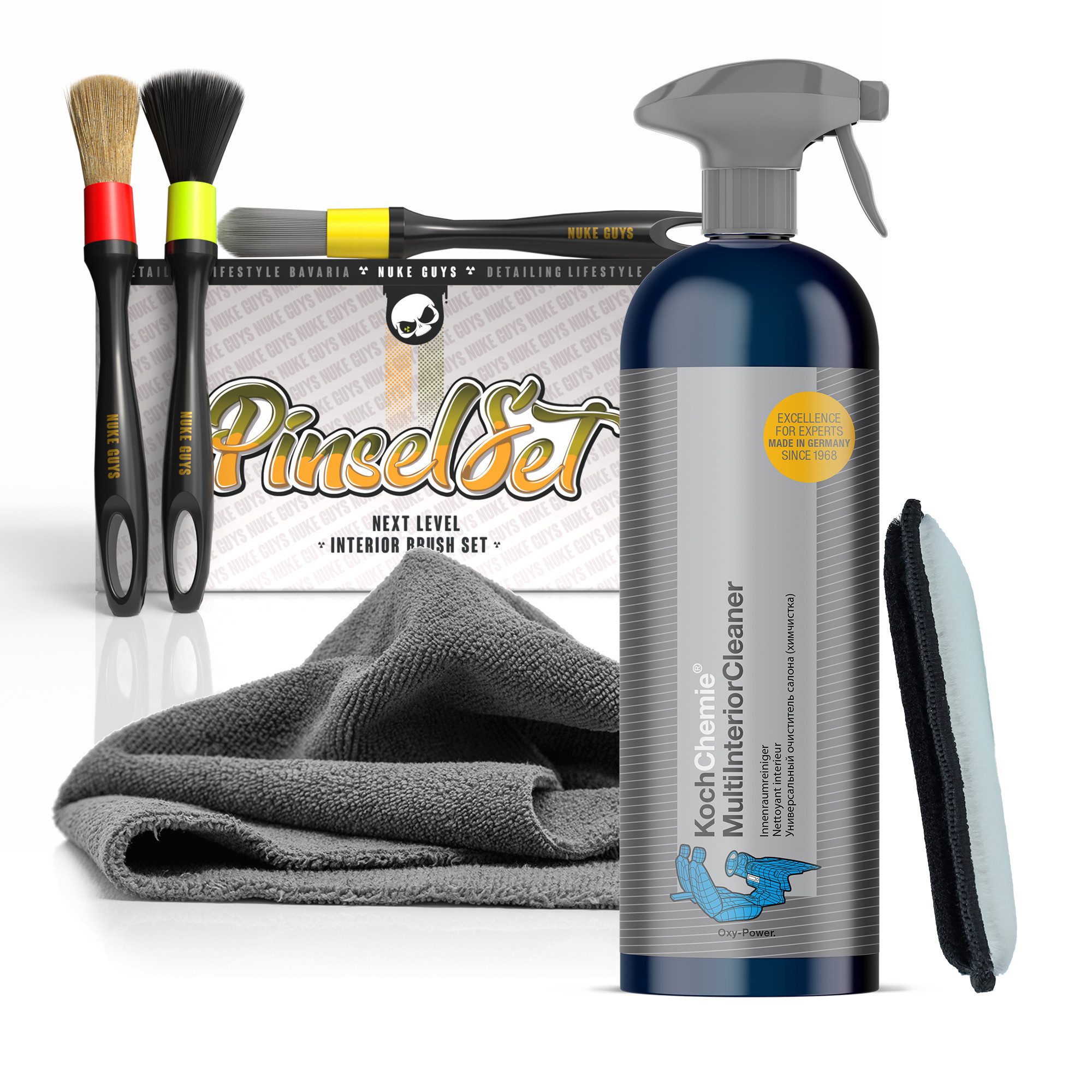Lieferumfang | 1x Koch Chemie InteriorCleaner 750 ml 1x Edgeless GreyLow Mikrofasertuch grau, 40x40 cm - 380 GSM 1x Wizard of Gloss Magic Interior Scrubber - Innenraumreinigungspad |