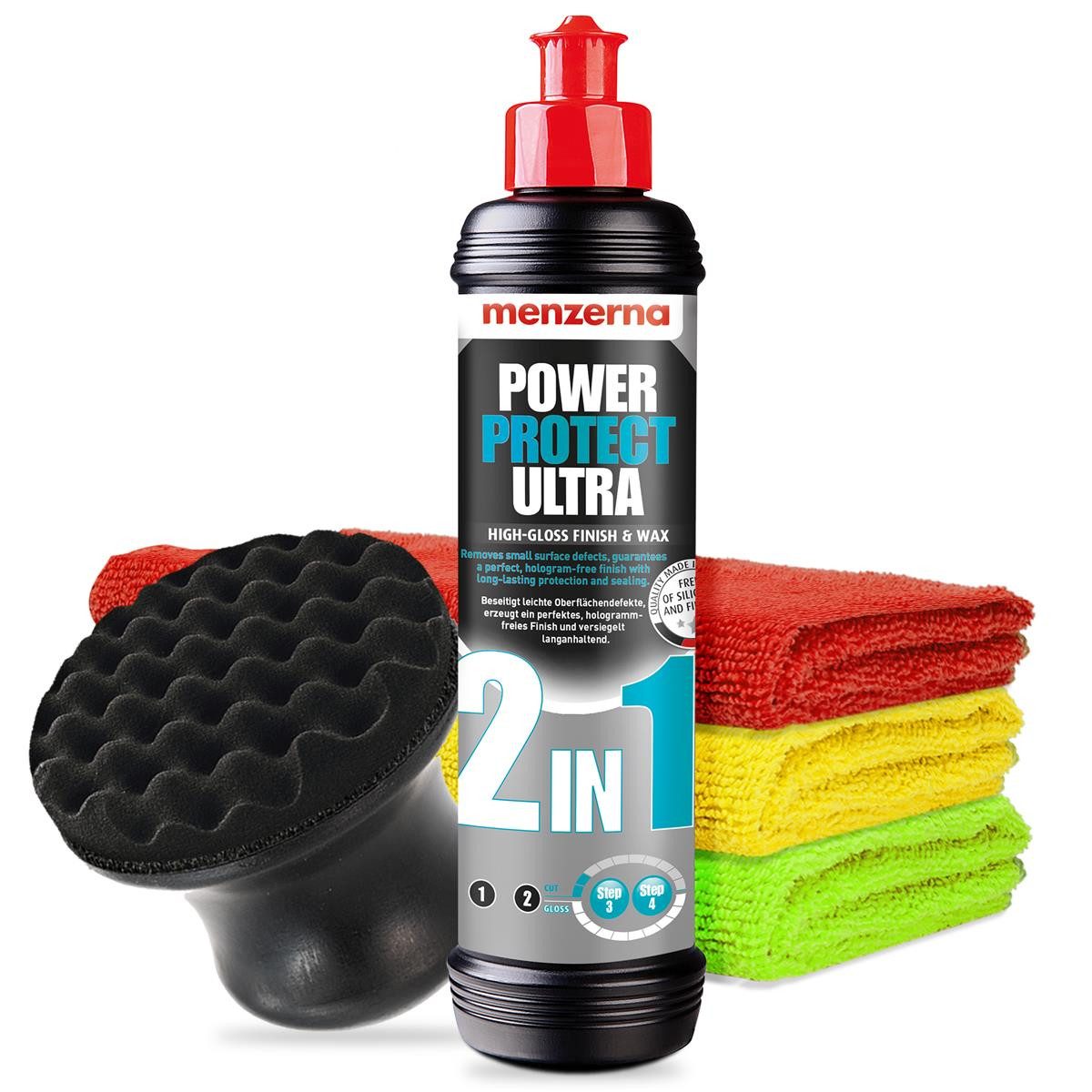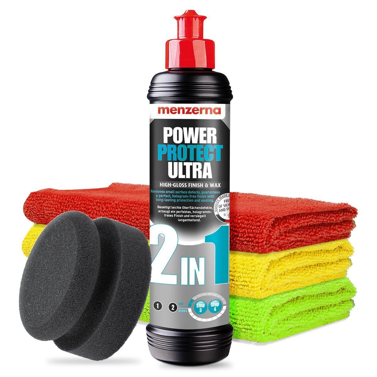 Lieferumfang | 1x Menzerna Lackversiegelung Power Protect Ultra 2in1 250ml 1x Menzerna 3er Pack Mikrofasertücher 1x Handpolierschwamm "Puck" |