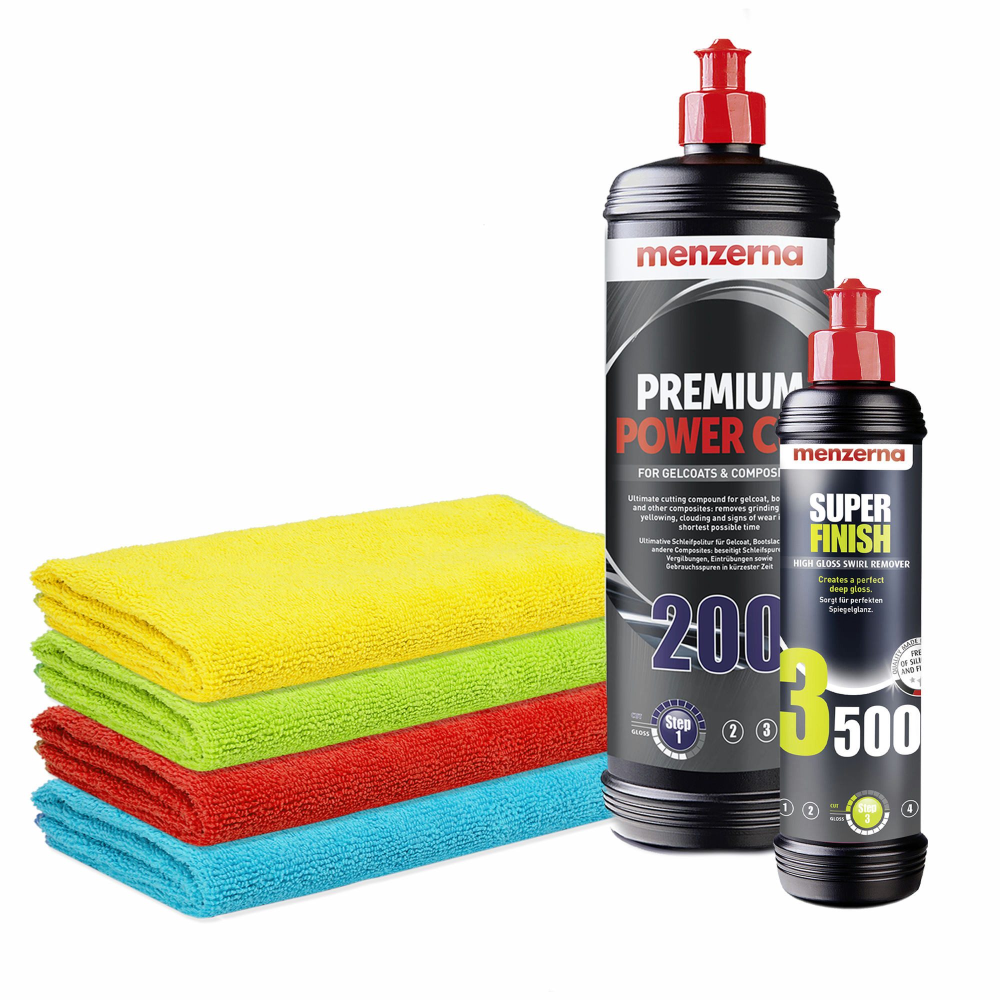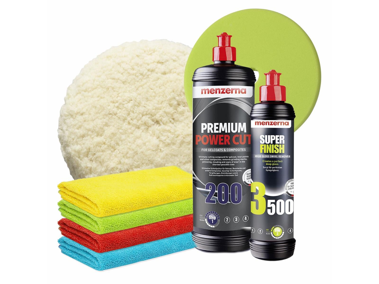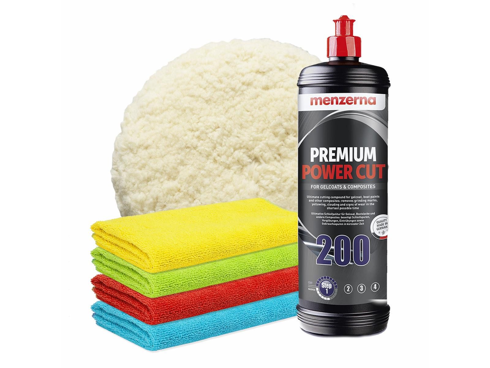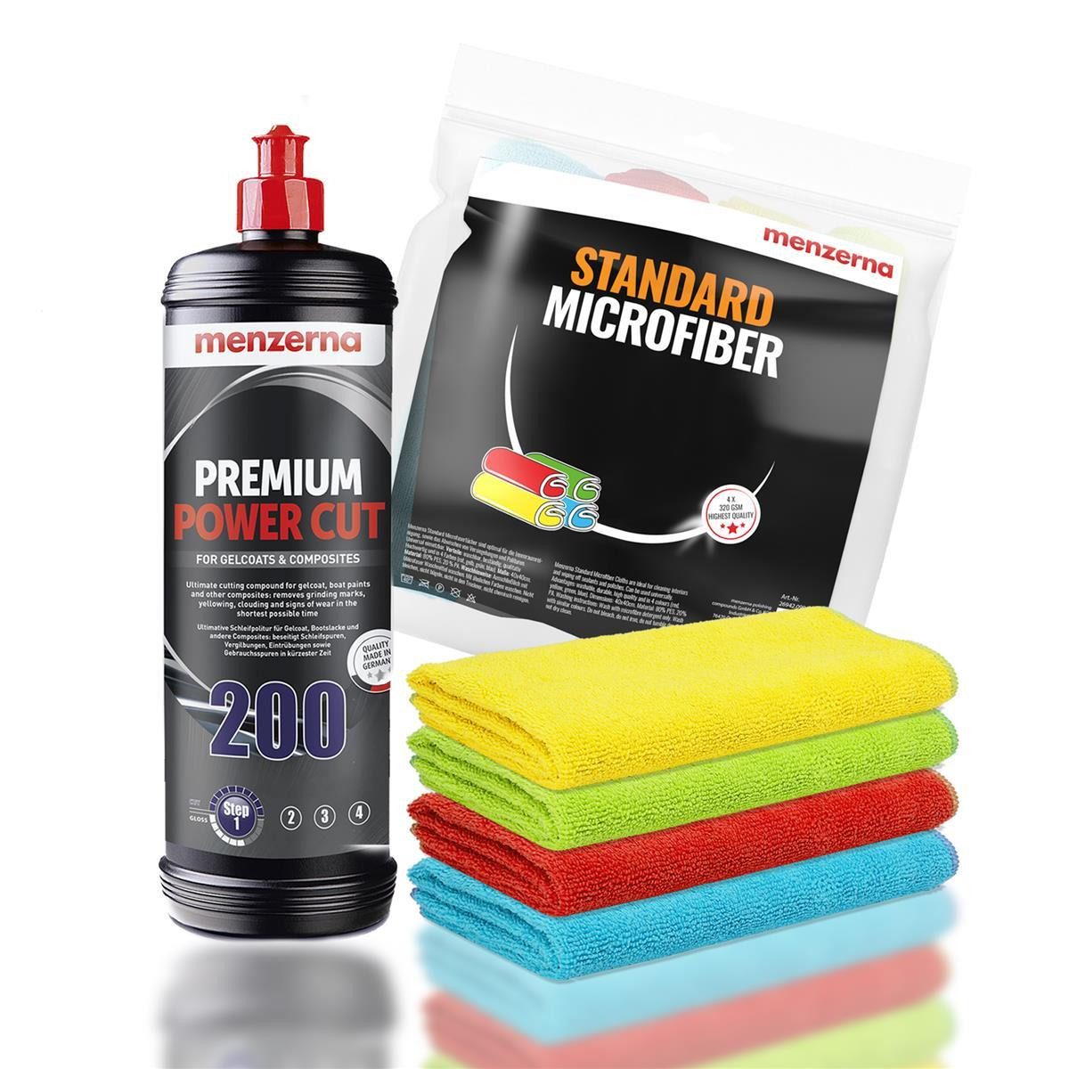 Lieferumfang | 1x Menzerna Premium Power Cut 200, 1 Liter 1x Menzerna 4er Pack Standard Mikrofasertuch, 320GSM, 40x40cm |