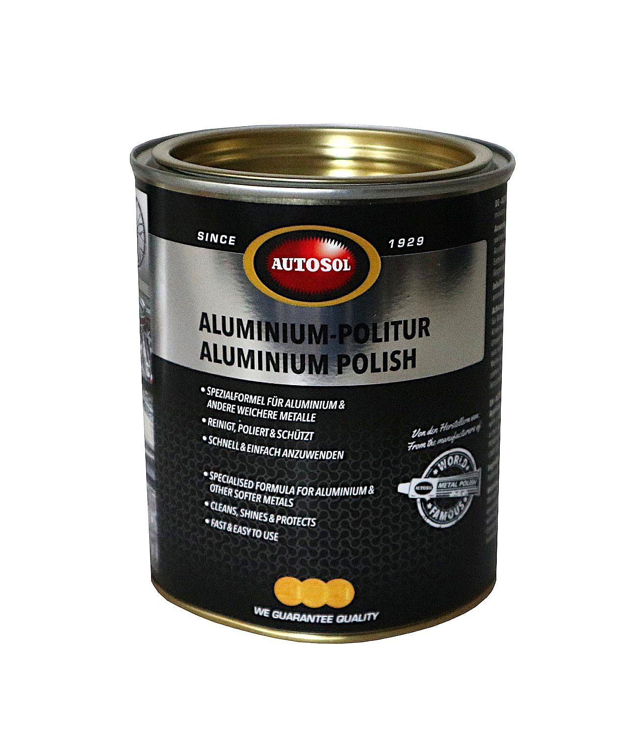 AUTOSOL Aluminium-Politur mit einem Inhalt von 750 ml. Diese Politur ist eine Spezialformel für Aluminium und andere weichere Metalle, z.Bsp. an Autos, Booten oder Stühlen. Sie reinigt, poliert und schützt. Hohe Qualität - made in Germany. Achtung: Verursacht Hautreizungen, Augenreizungen, schädlich für Wasserorganismen! Darf nicht in die Hände von Kindern gelangen.