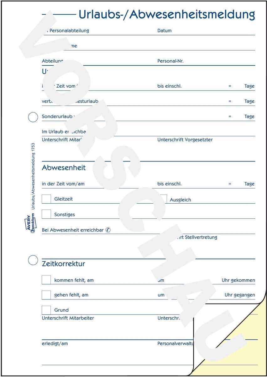 Avery Zweckform Formularblock Formularbuch Urlaubsantrag A5 2x40 Blatt Packung mit 10 Stück
