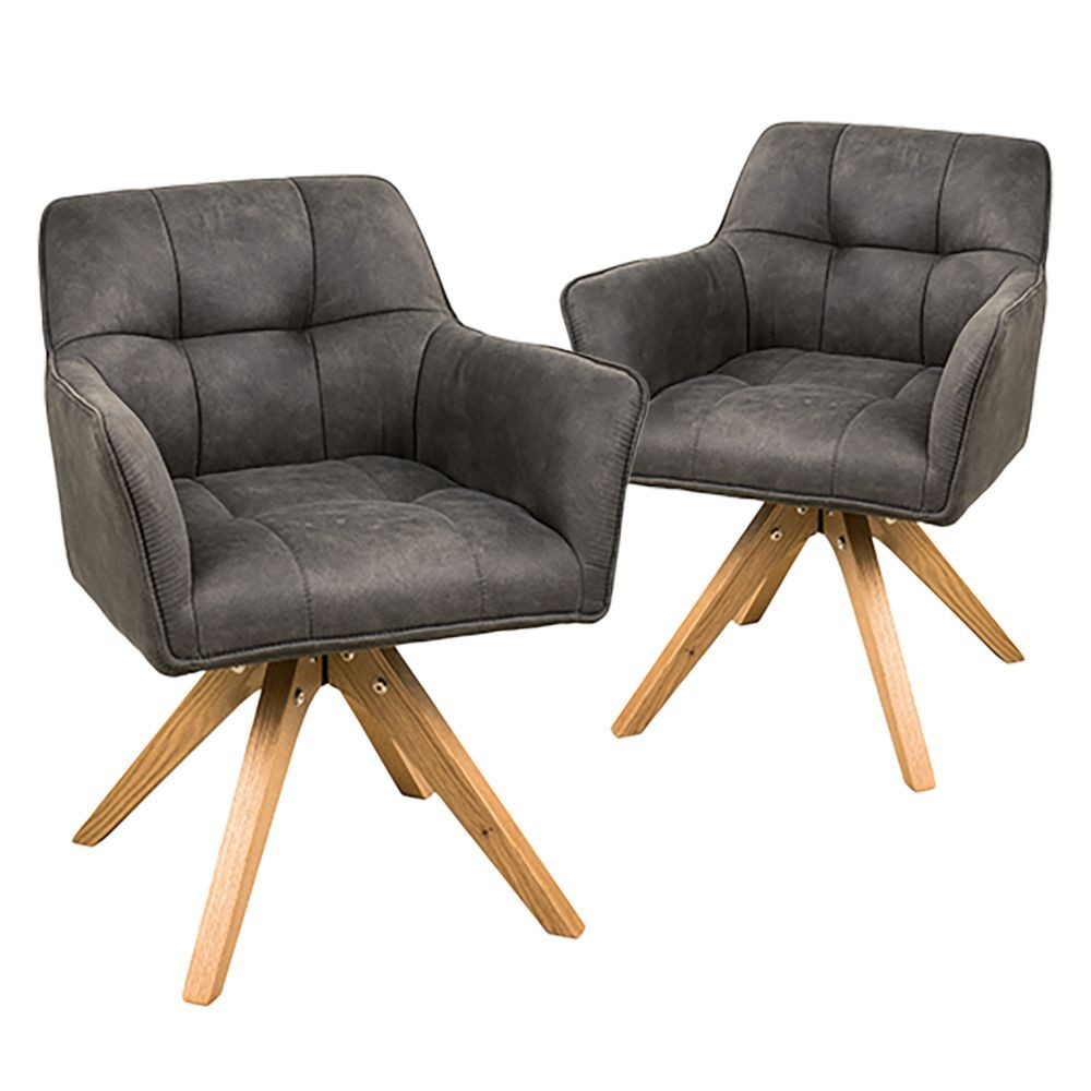 Ein moderner Vollpolsterstuhl mit einem drehbaren Holzgestell. Er verfügt über ein Drehgestell mit 360 Grad Drehfunktion.