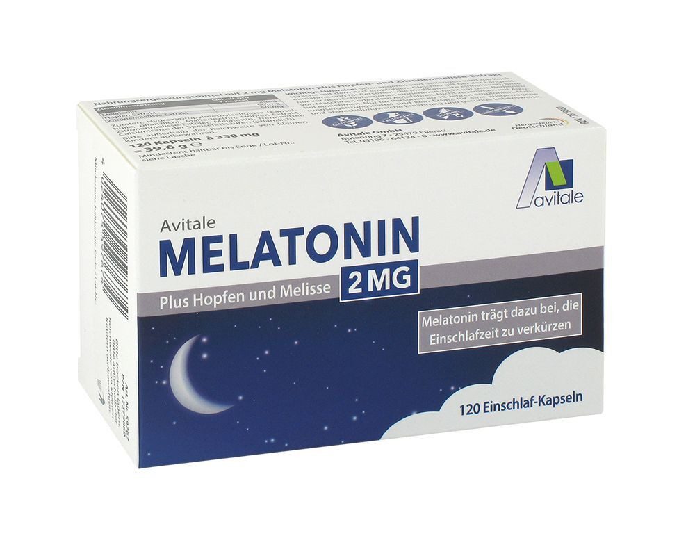 Ausreichender und erholsamer Schlaf ist für die körperliche und mentale Regeneration enorm wichtig. Avitale MELATONIN 2MG ist ein Kombinationspräparat mit dem „Schlafhormon“ Melatonin plus Hopfen und Melisse. Die Einschlaf-Kapseln zur Verkürzung der Einschlafzeit enthalten 2 mg Melatonin pro Kapsel. Melatonin ist ein Neurohormon und wird vom Organismus in der Zirbeldrüse im Gehirn produziert. Es steuert den menschlichen Schlaf-Wach-Rhythmus. Während des Tages wird die Melatonin-Ausschüttung vom Gehirn durch den Lichteinfall stark herabgesetzt. Bei Dunkelheit wird das Hormon wieder abgegeben und fördert das Einschlafen.