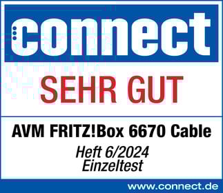 Die AVM Fritz!Box 6670 Cable erzielt im Einzeltest des Magazins „connect“ das Gesamtergebnis „sehr gut (428 Punkte)“ (von max. 500). Die WLAN-Leistung ist hervorragend. Die umfangreiche Ausstattung überzeugt u. a. mit diversen Funktionen wie Telefonie, Smarthome und DVB-C-Streaming im Heimnetz. Außerdem ist der Router sehr schnell eingerichtet und einfach zu bedienen. Insgesamt ist der „sehr gute“ WLAN-Router „das erste Wi-Fi-7-Modell“ von AVM.