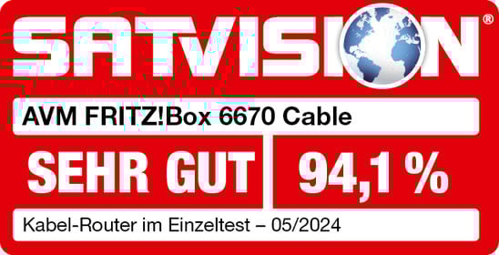 Die AVM FRITZ!Box 6670 Cable erzielt im Einzeltest des Magazins „Satvision“ das Gesamtergebnis „SEHR GUT (94,1 %)“. Die WLAN-Übertragung ist „sehr gut“. Die umfangreiche Ausstattung überzeugt u. a. mit vielen Anschlüssen und Funktionen sowie einer hochwertigen Verarbeitung. Außerdem hat das Gerät eine sehr große Reichweite. Insgesamt erreicht der WLAN-Router ein „starkes Gesamtergebnis“.
