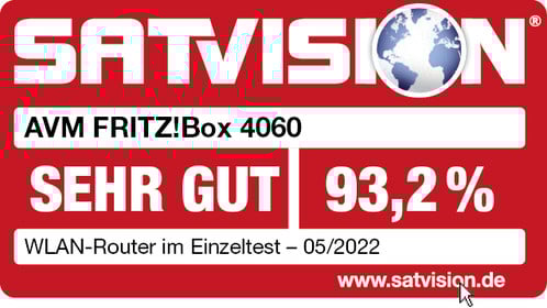 Das Testmagazin „SATVISION“ prüft den AVM FRITZ!Box 4060 im Einzeltest. Die Übertragung klappt „sehr gut“. Das Gerät hat eine sehr hohe Reichweite. Er ist umfangreich ausgestattet. Zwar ist kein Modem integriert. Dafür überzeugt die einfache Installation und Bedienung. Der „vielseitige“ WLAN-Router für DSSL-, Kabel-Internet- und Glasfaser-Modems erreicht das Testurteil „SEHR GUT (93,2 %)“.